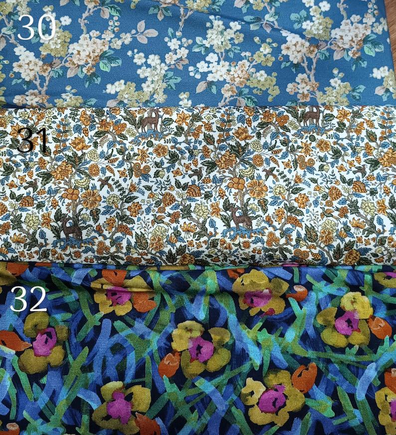 One side is printed Liberty of London stretch jersey (cotton, viscose or modal depending on the model), one side is soft and supple knit with large ribbing.