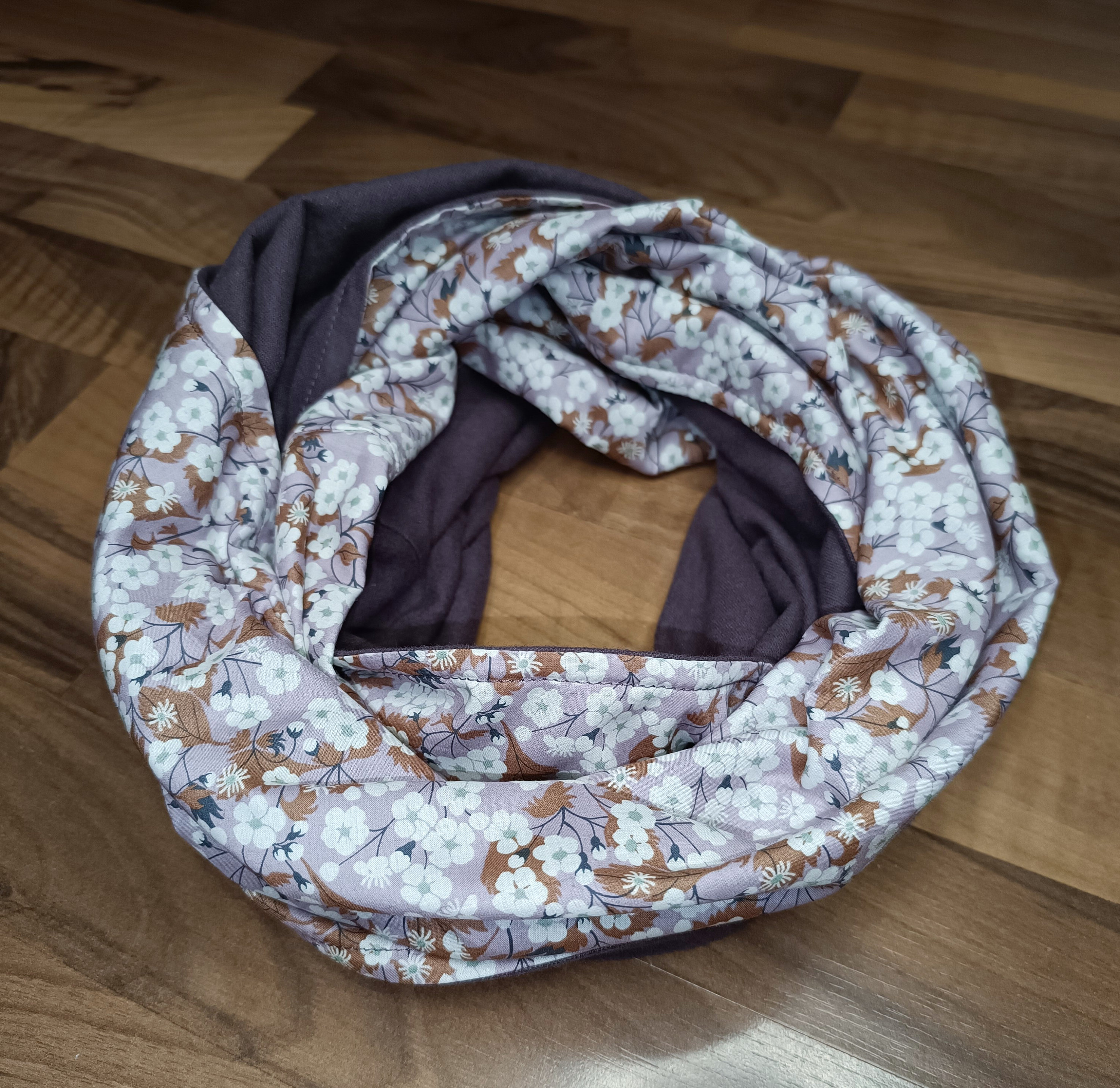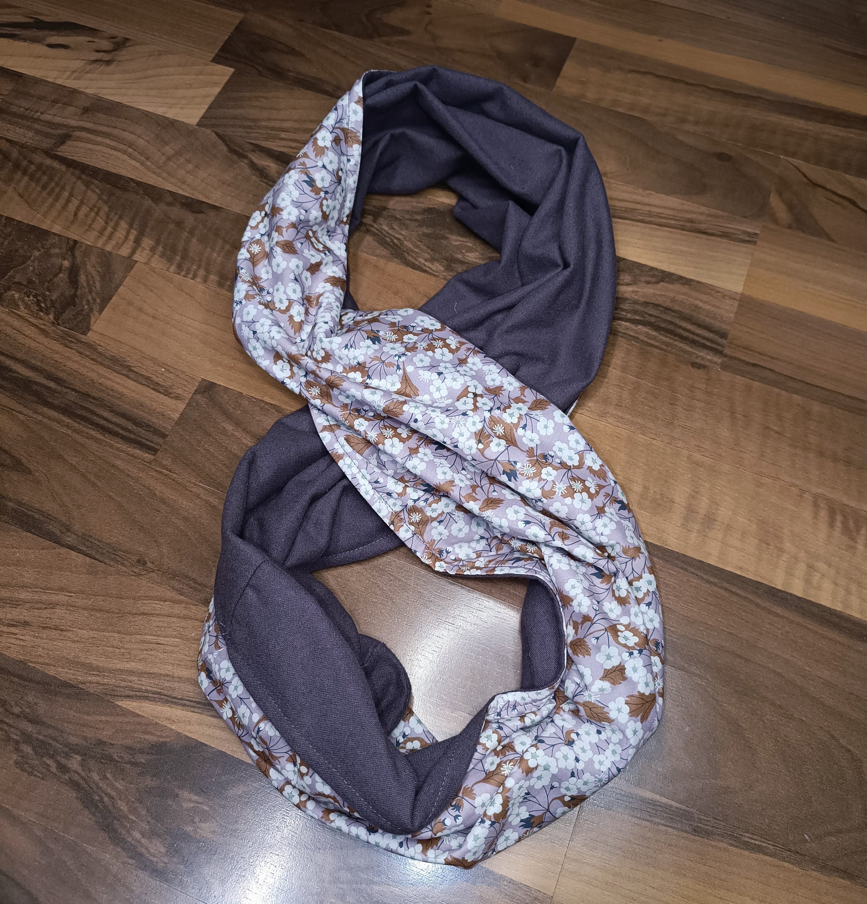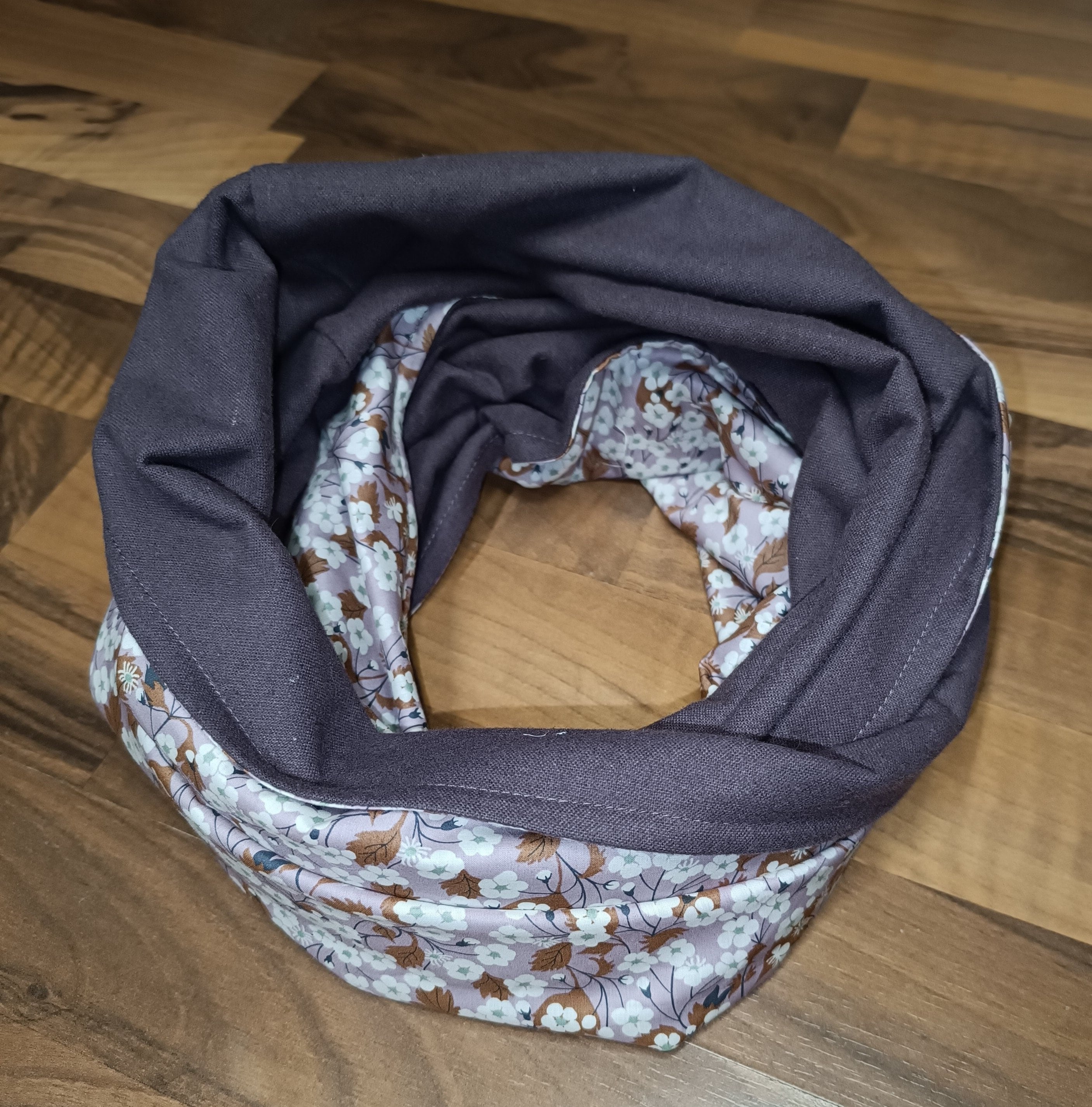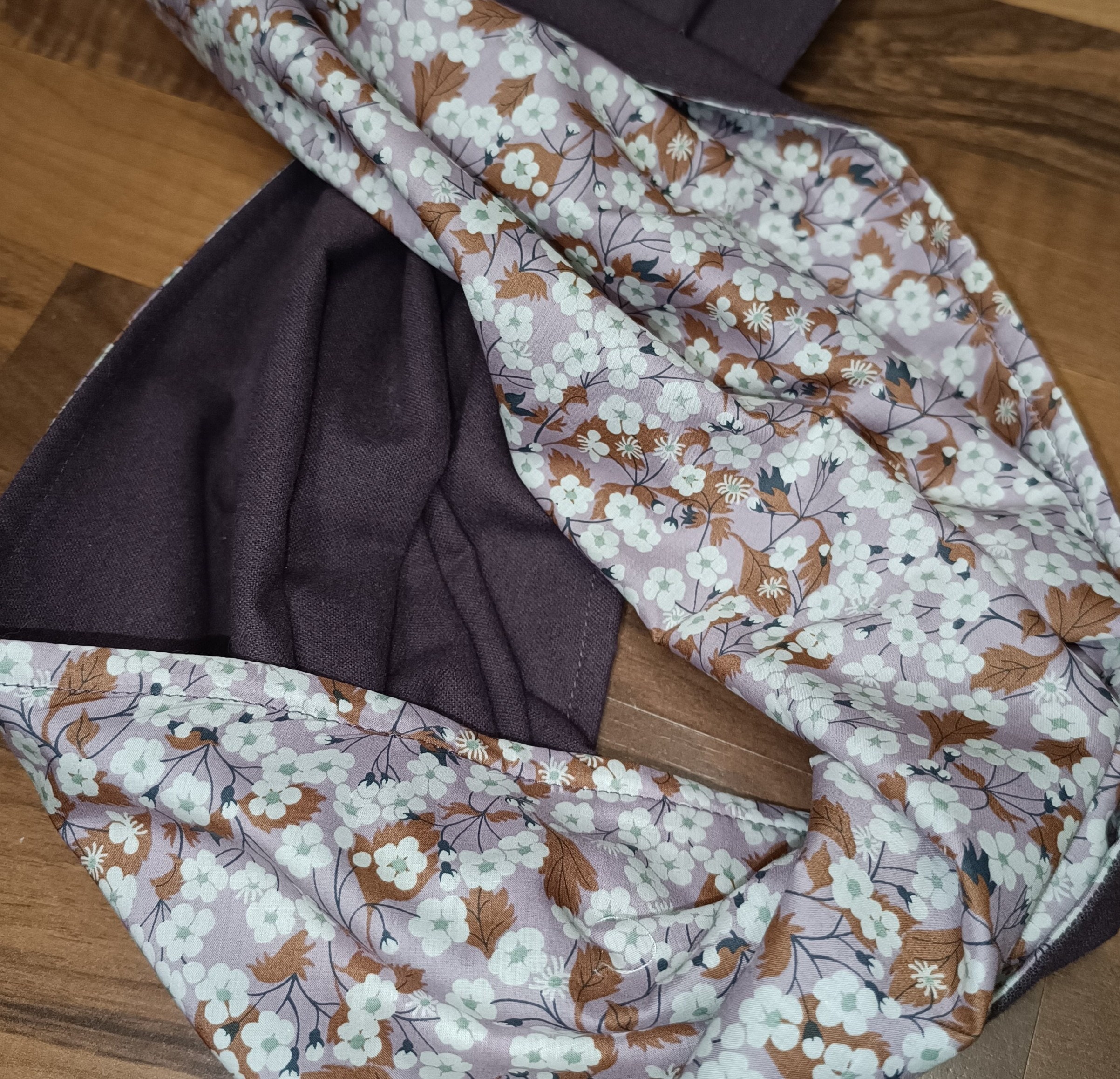 Made from Liberty Of London organic tana lawn cotton printed with Mitsi praline, it is lined with a very soft dark purple cotton flannel.