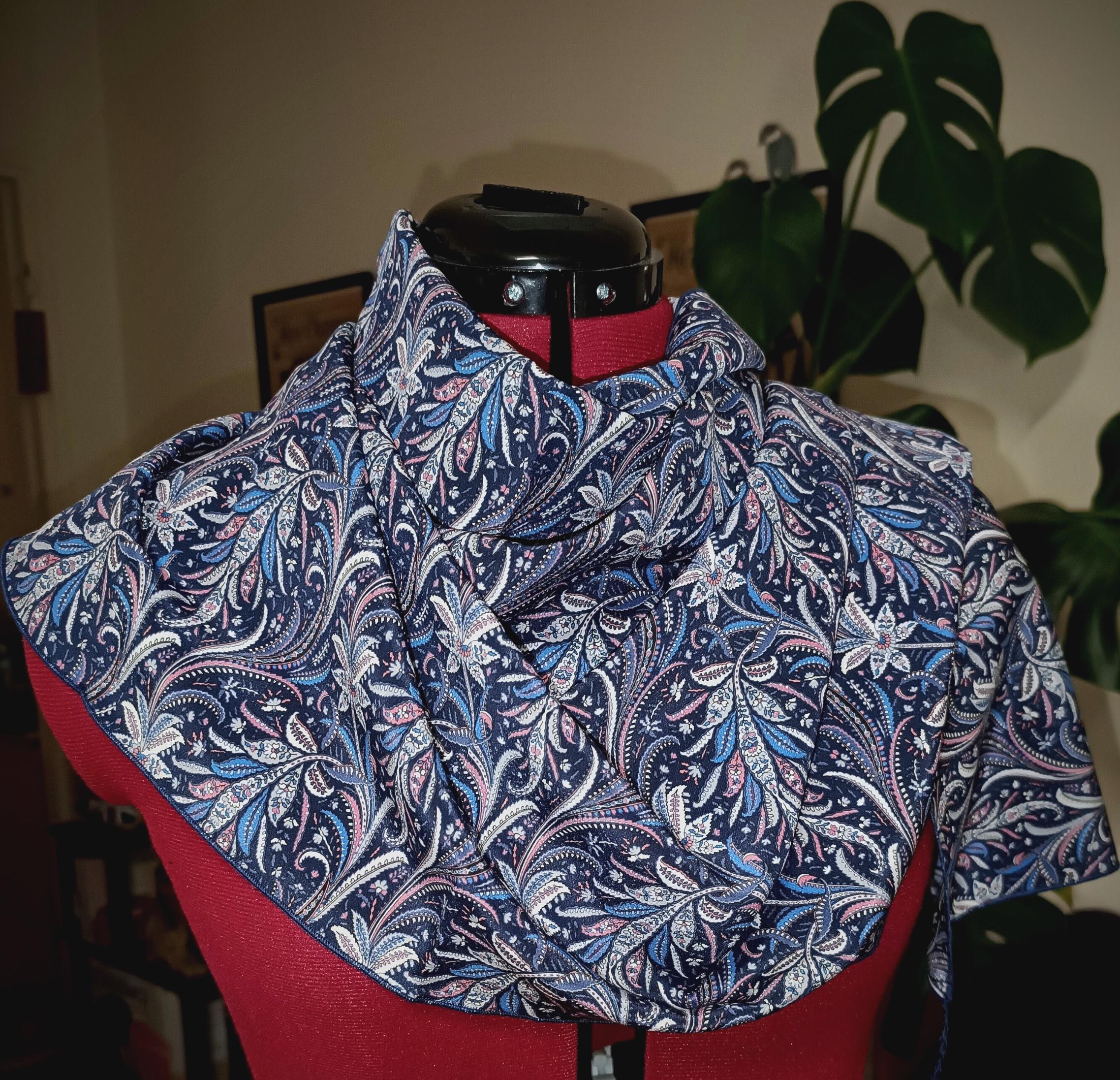 Contrasting rolled edging finish to avoid weighing down the material, and English stitching for the snood.