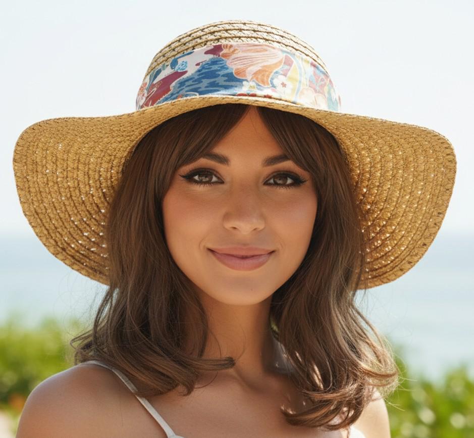 Head circumference approximately 56/58cm. Adjustable with a sliding tie. Decorative cotton cord. Total diameter 38cm. Hand-sewn ribbon with an invisible stitch.