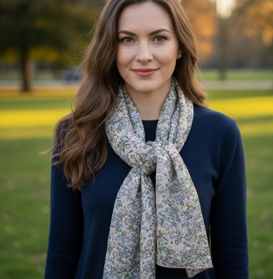 Made from a superb 100% Liberty of London silk muslin, airy and light, its pastel print is full of delicacy.
