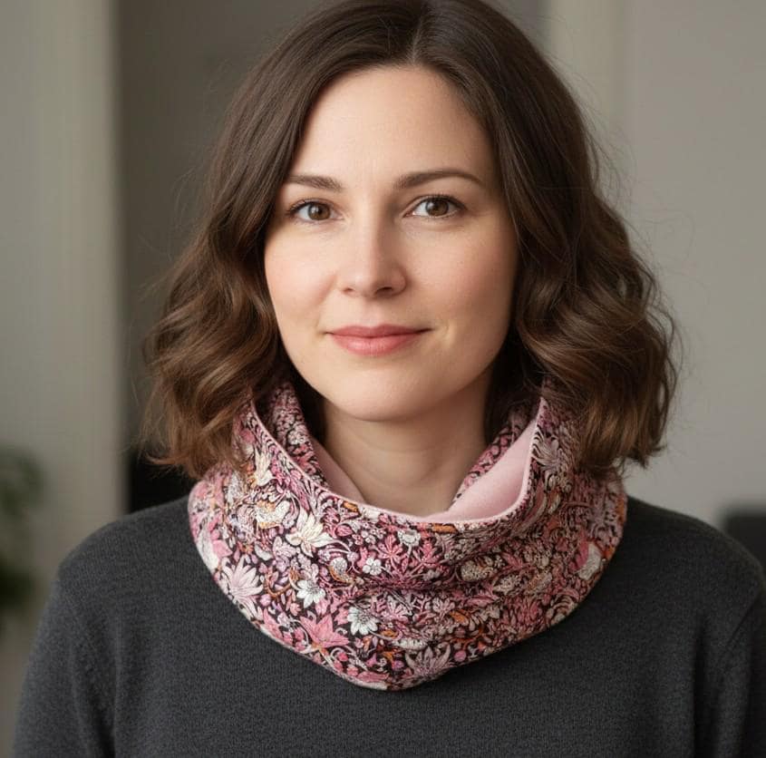 Dimensions: 44cm wide and 134cm circumference (double snood, 2 wraps). Finished with topstitched edges.