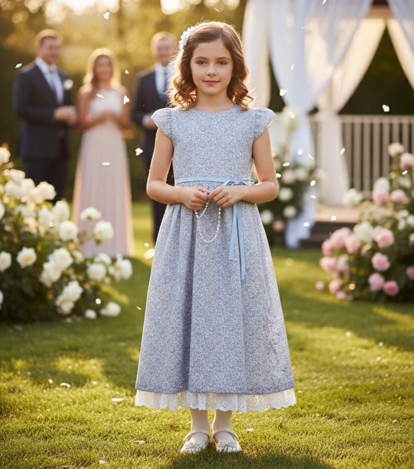 Long dress for girls in pure cotton Liberty print, customizable and made to measure in the fabric of your choice.