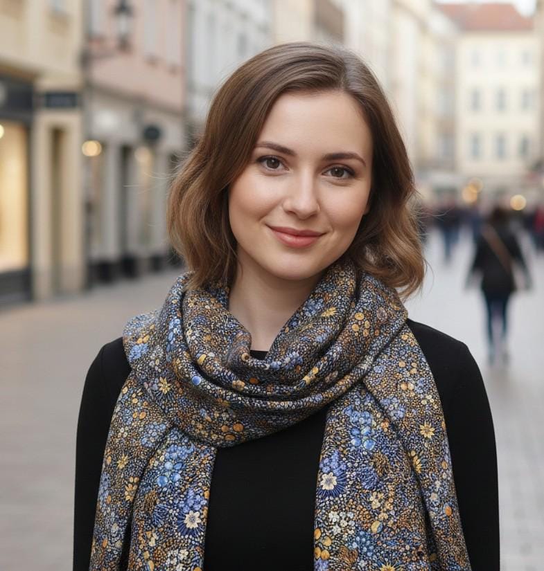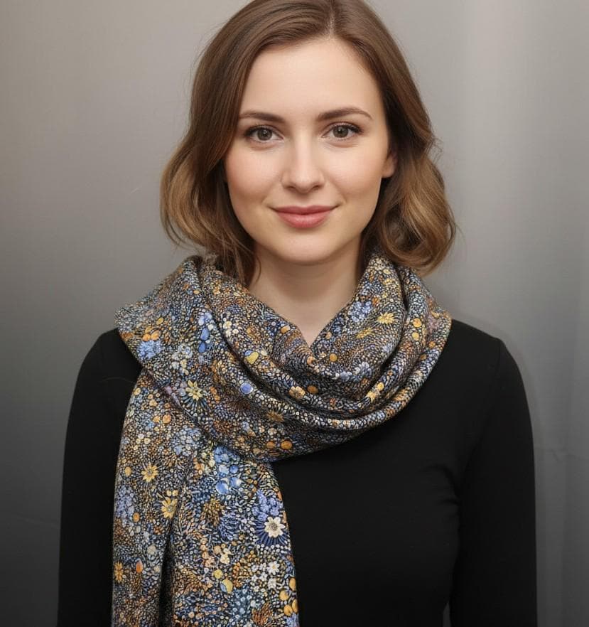 The scarf needs to be seen. The material is so beautiful. The texture and the brilliant colors! The finishing is carefully stitched. Just lovely!