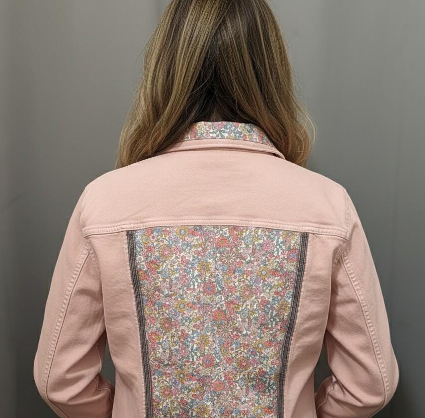 Customization done on a second-hand women's denim jacket in like-new condition, in a very pretty powder pink color. Composition: 99% cotton, 1% elastane.