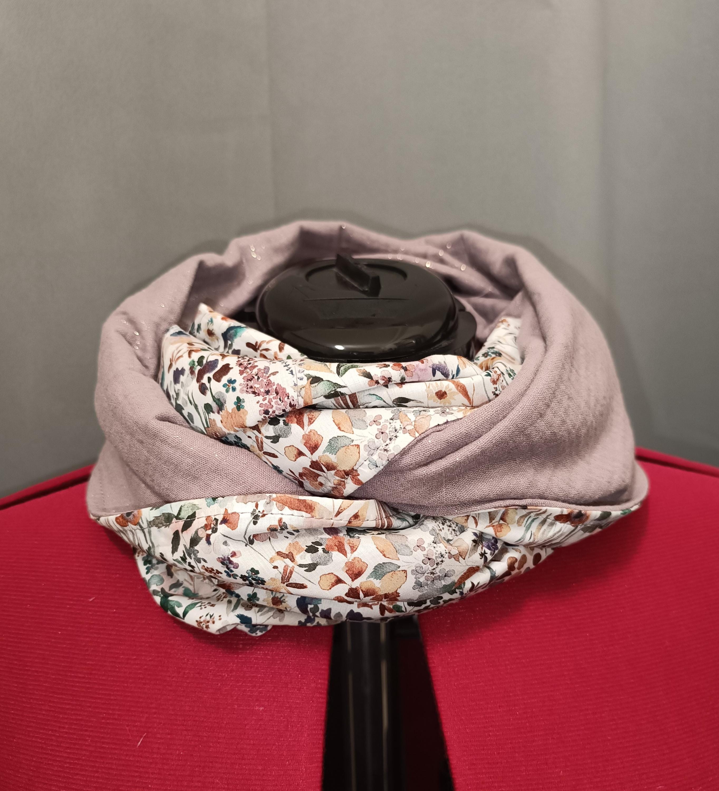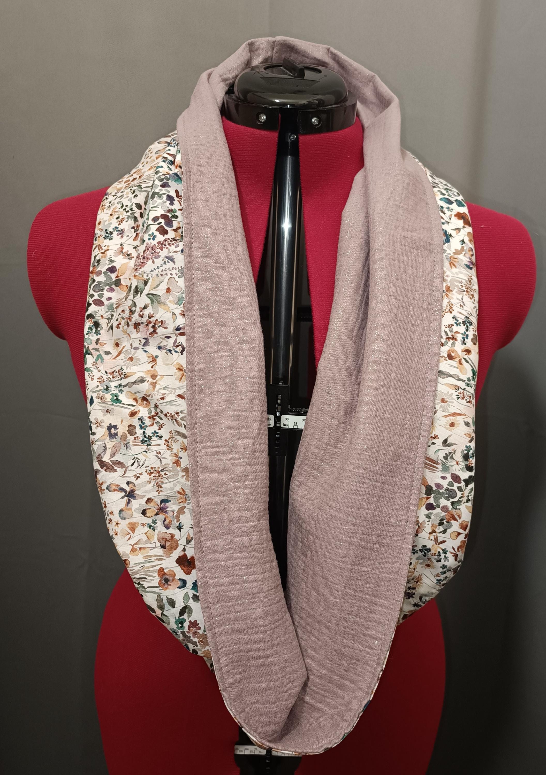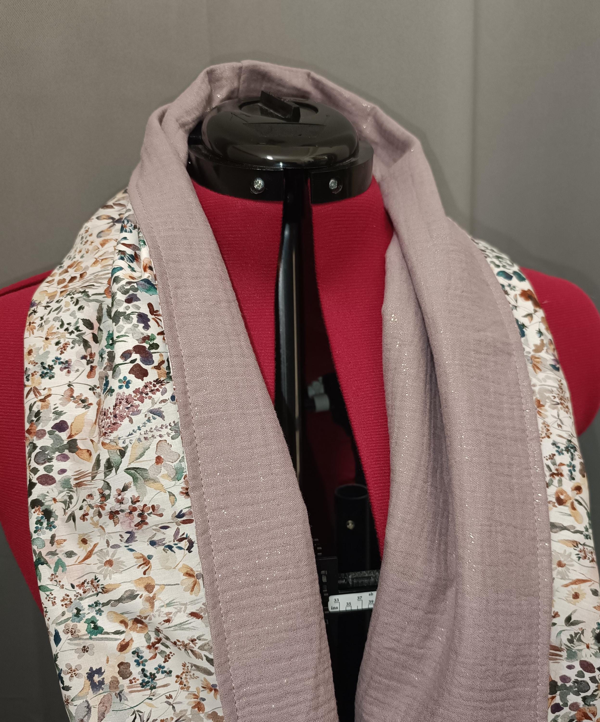 Dimensions 55cm wide and 130cm in diameter (double snood, 2 loops). Finished with topstitched edges.