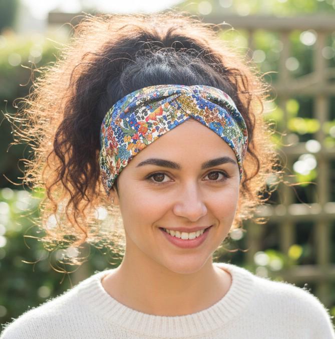 Liberty jersey headband with Margaret Annie rainbow motif.