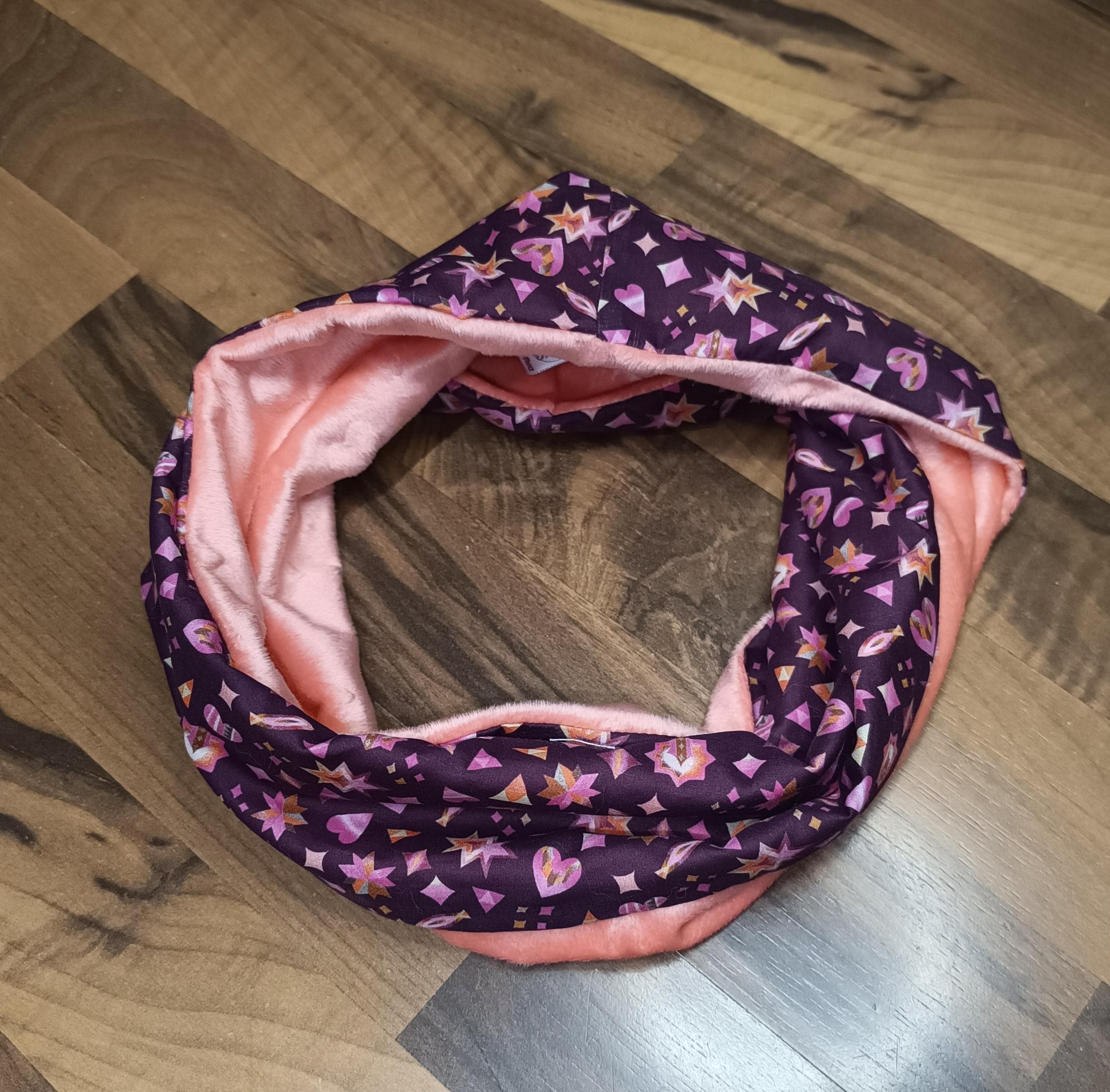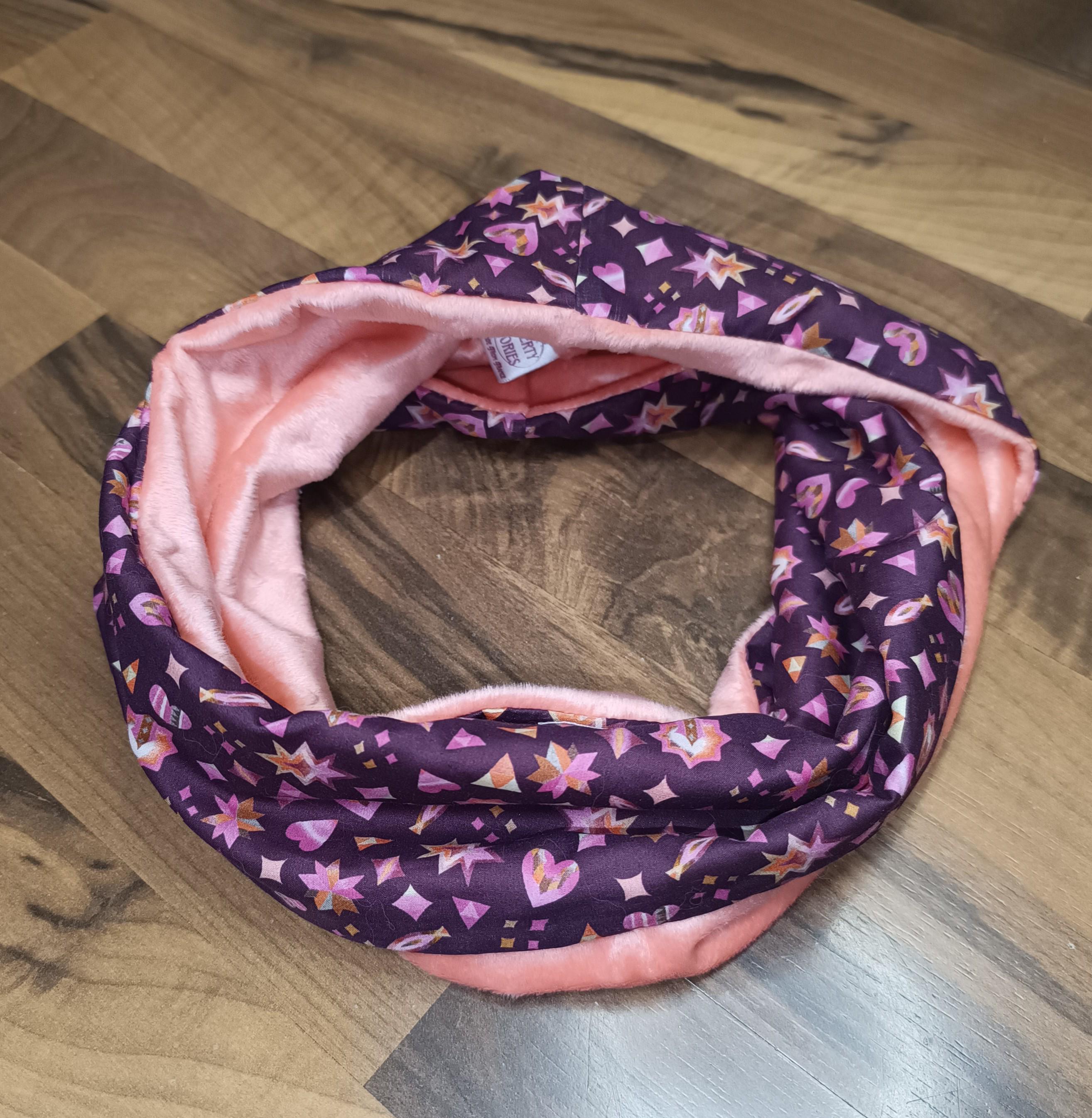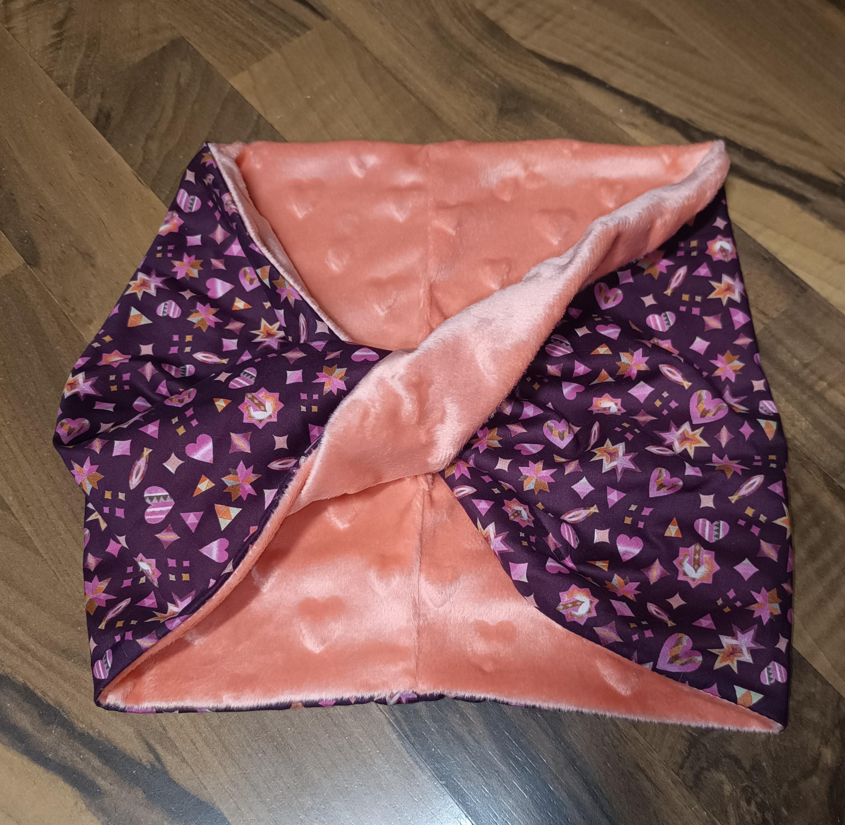 Liberty She's a Moypup and coral heart minky neck warmer for children.