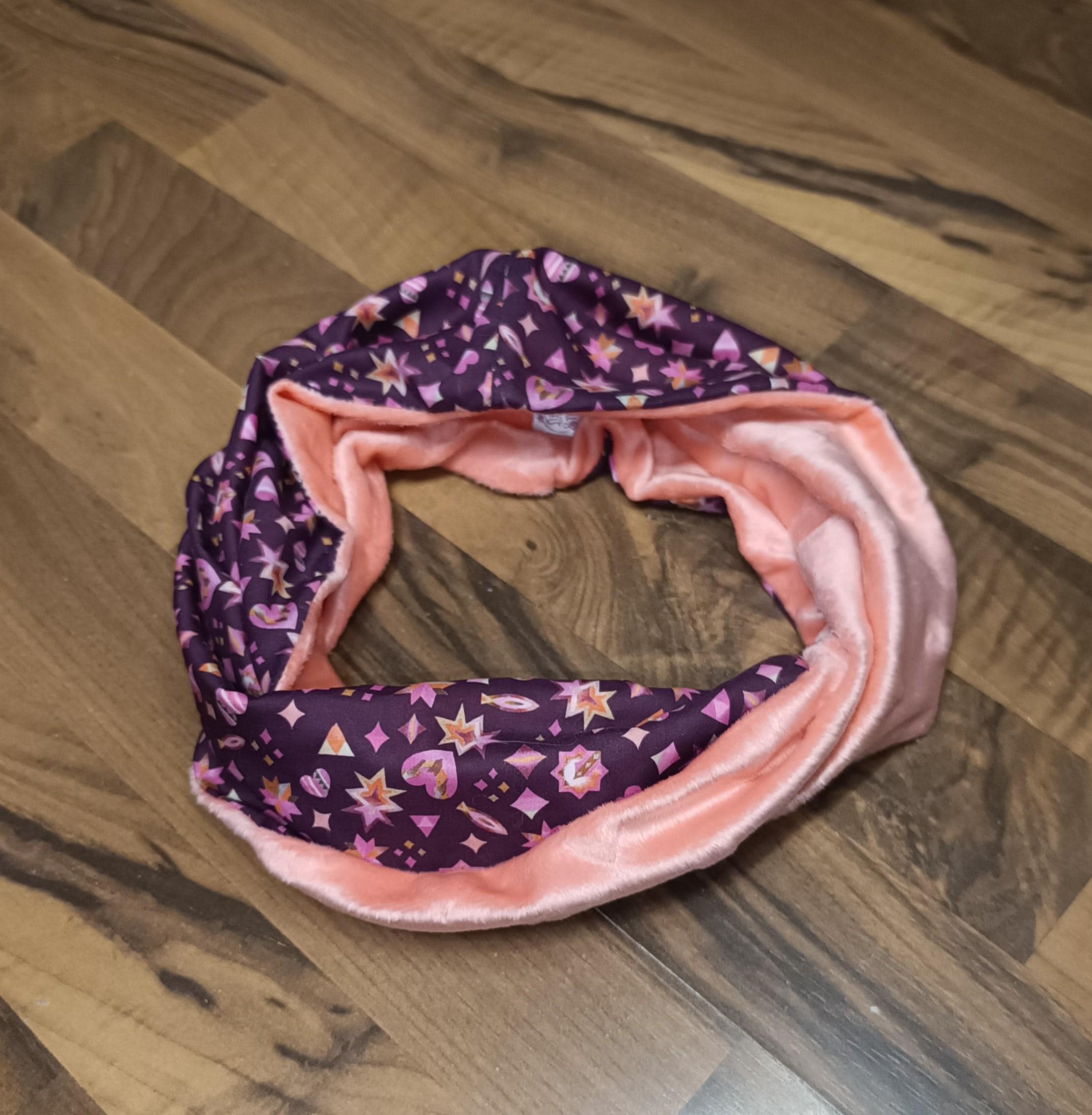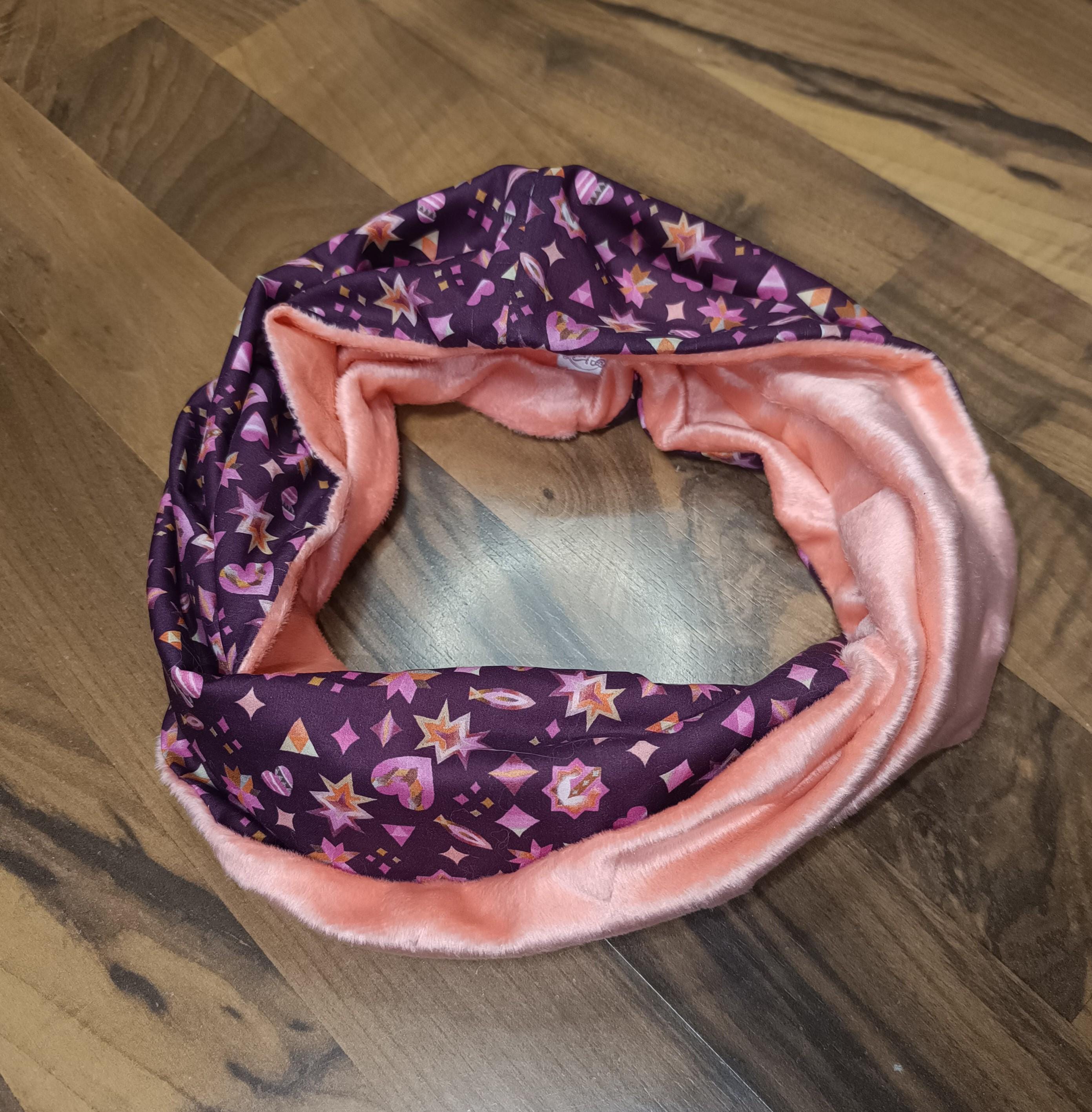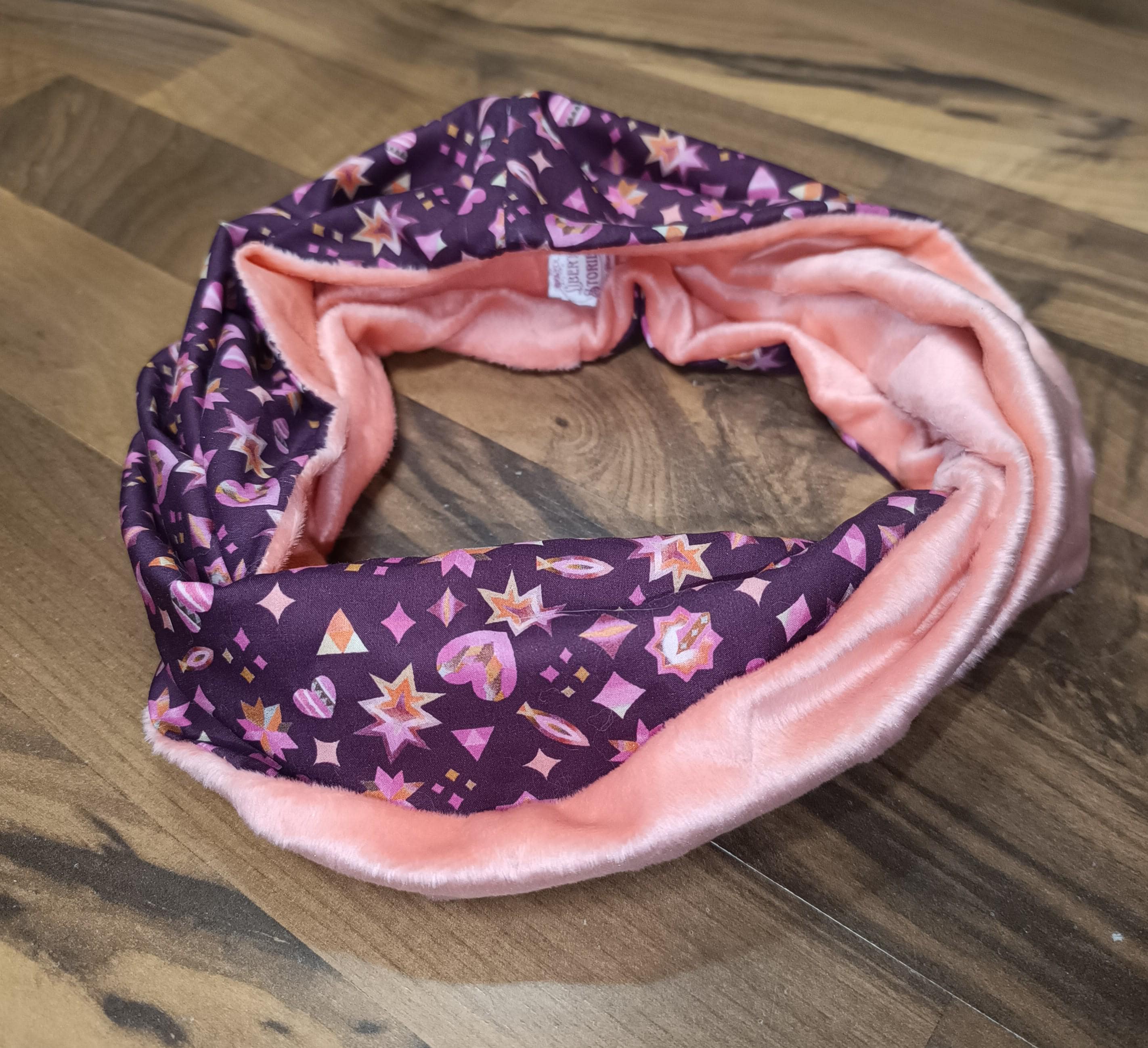 Liberty She's a Moypup and coral heart minky neck warmer for children.