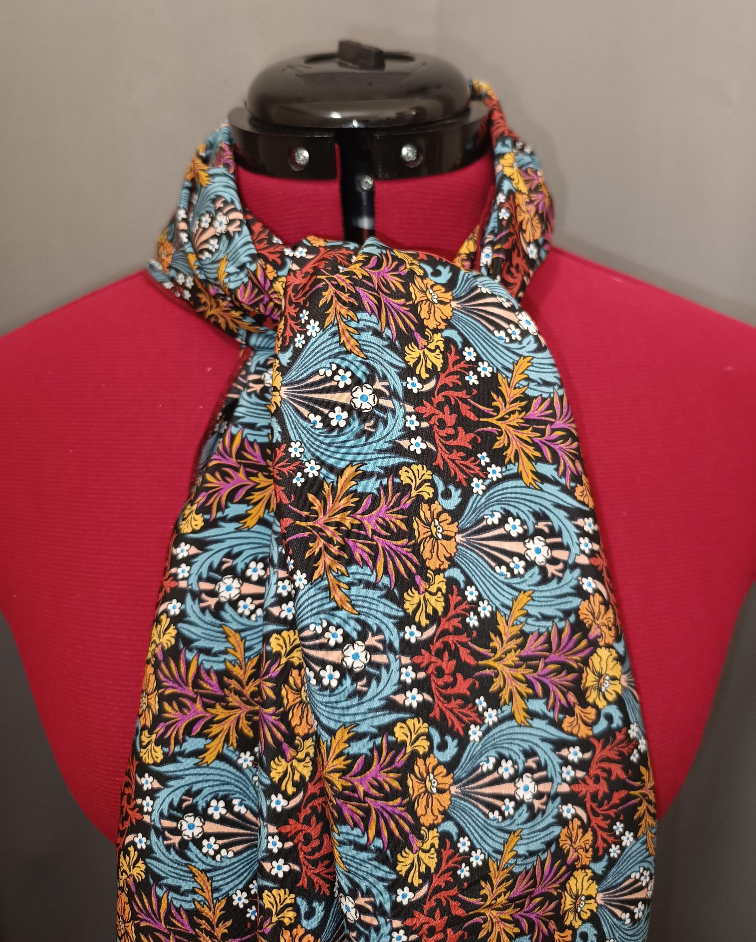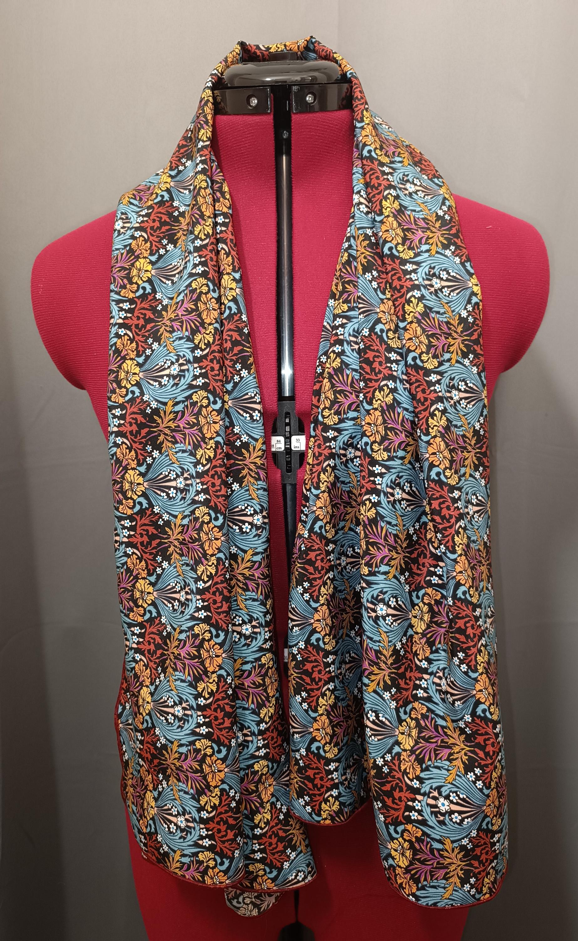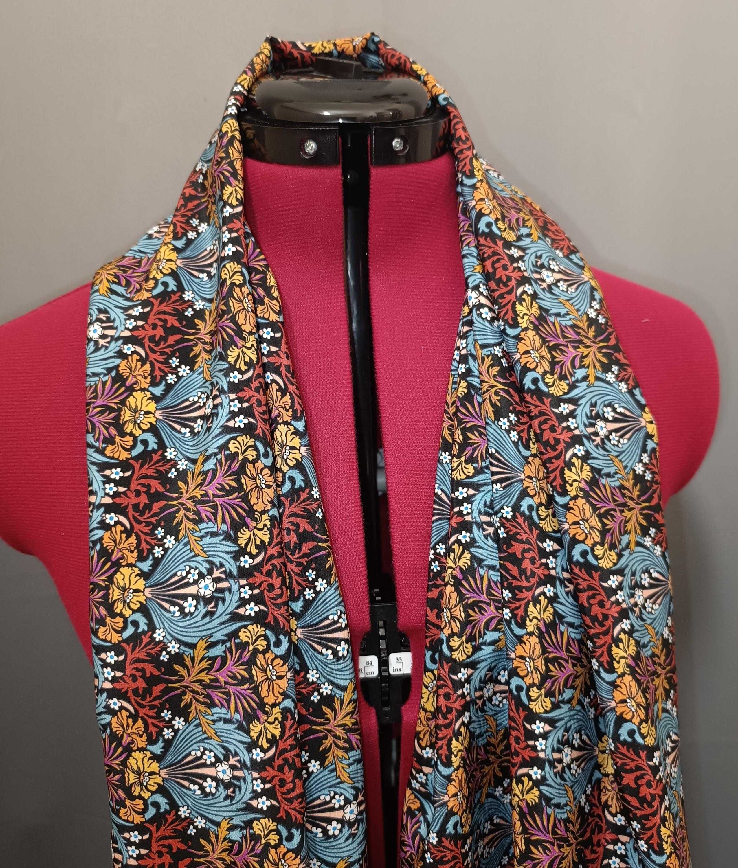 Liberty silk scarf, crepe de chine, Bronwyn pattern, black background