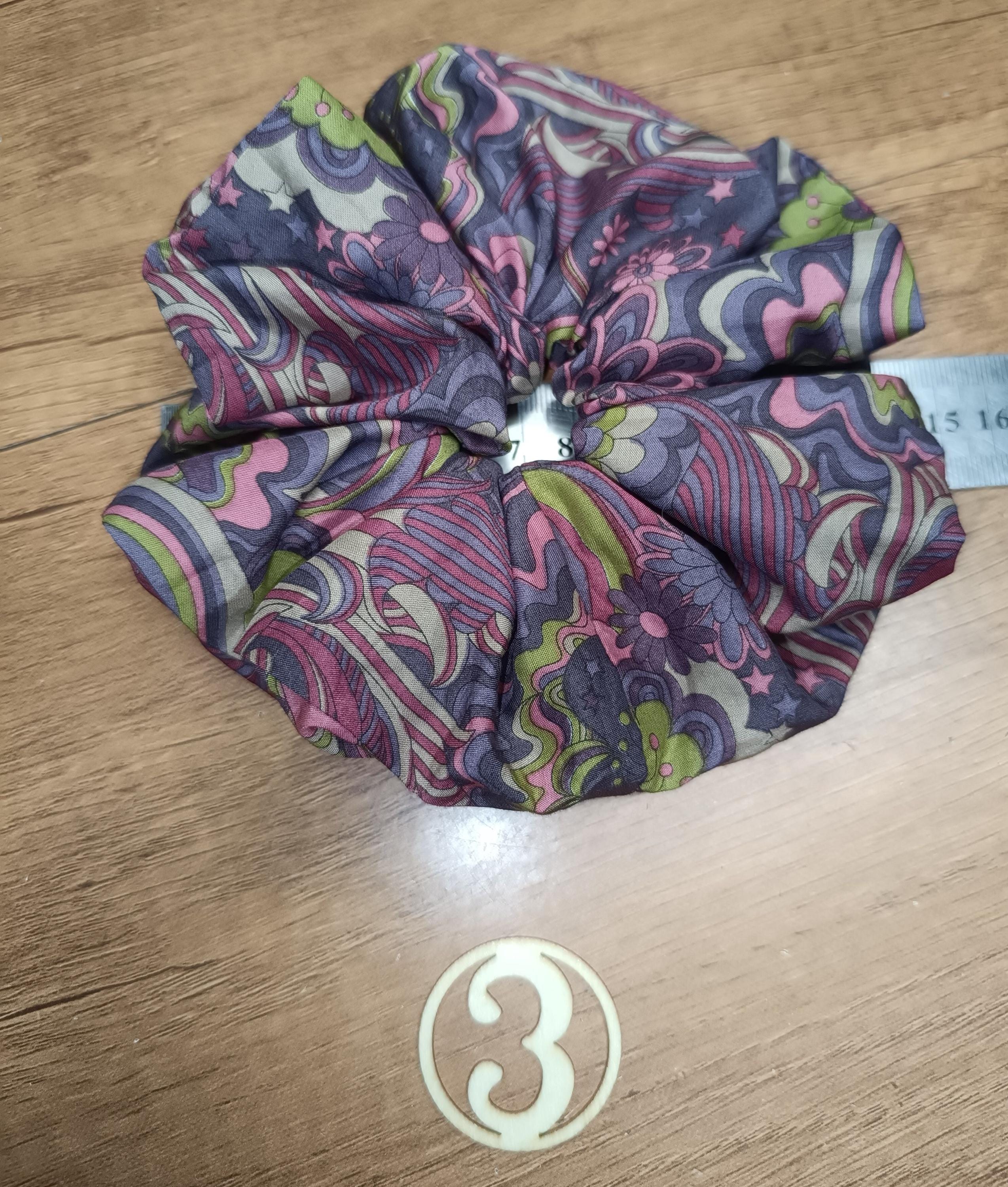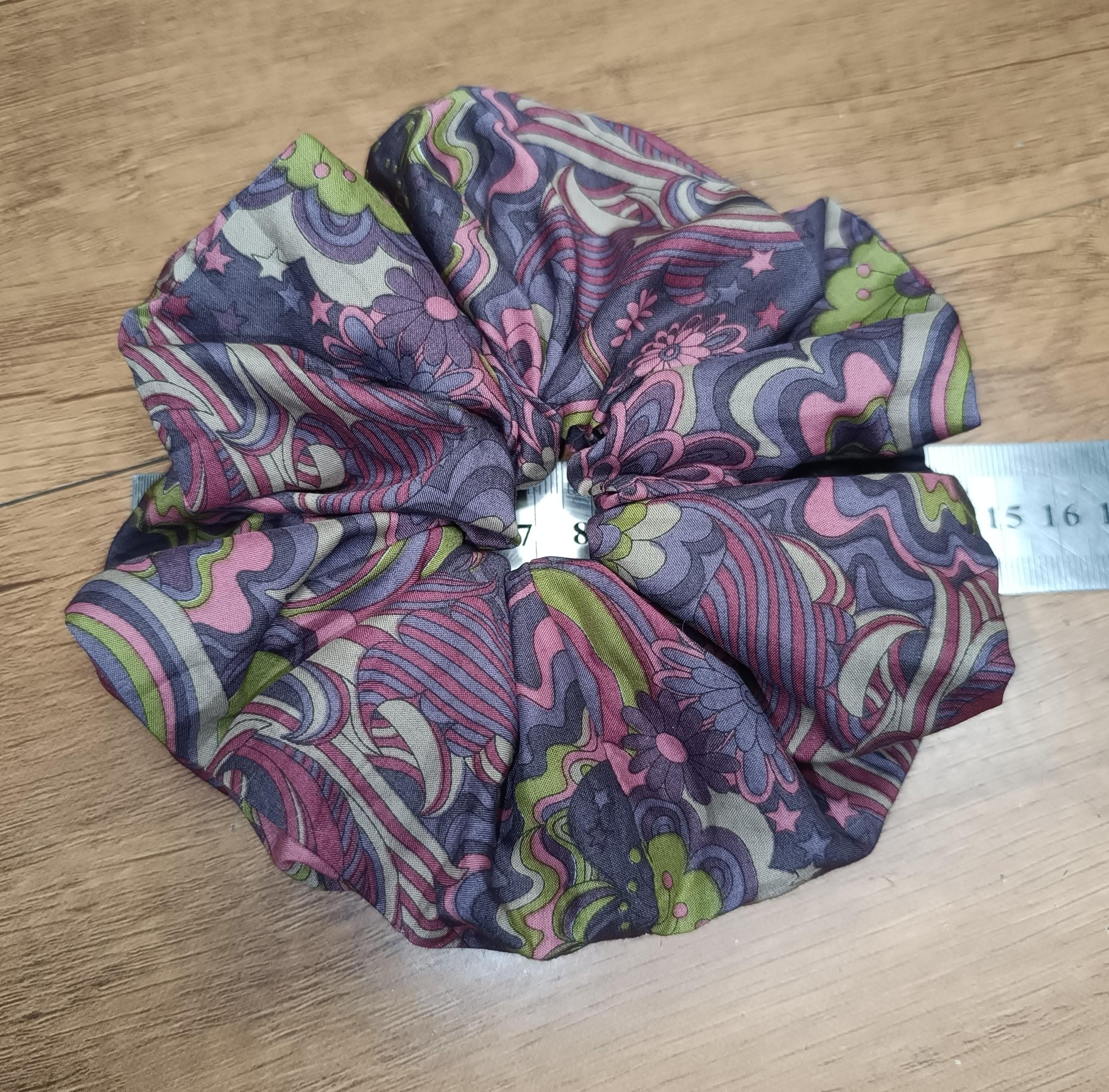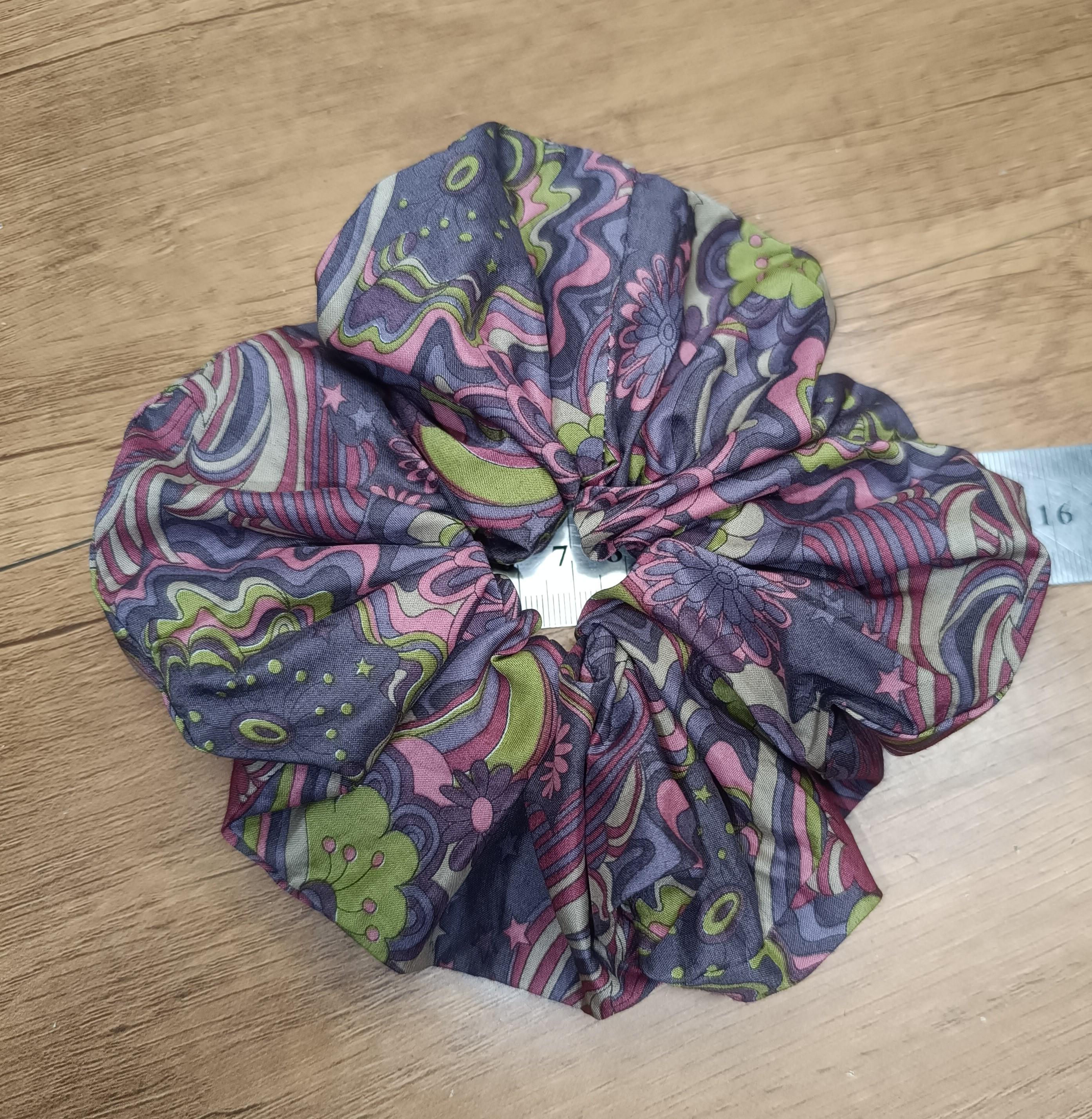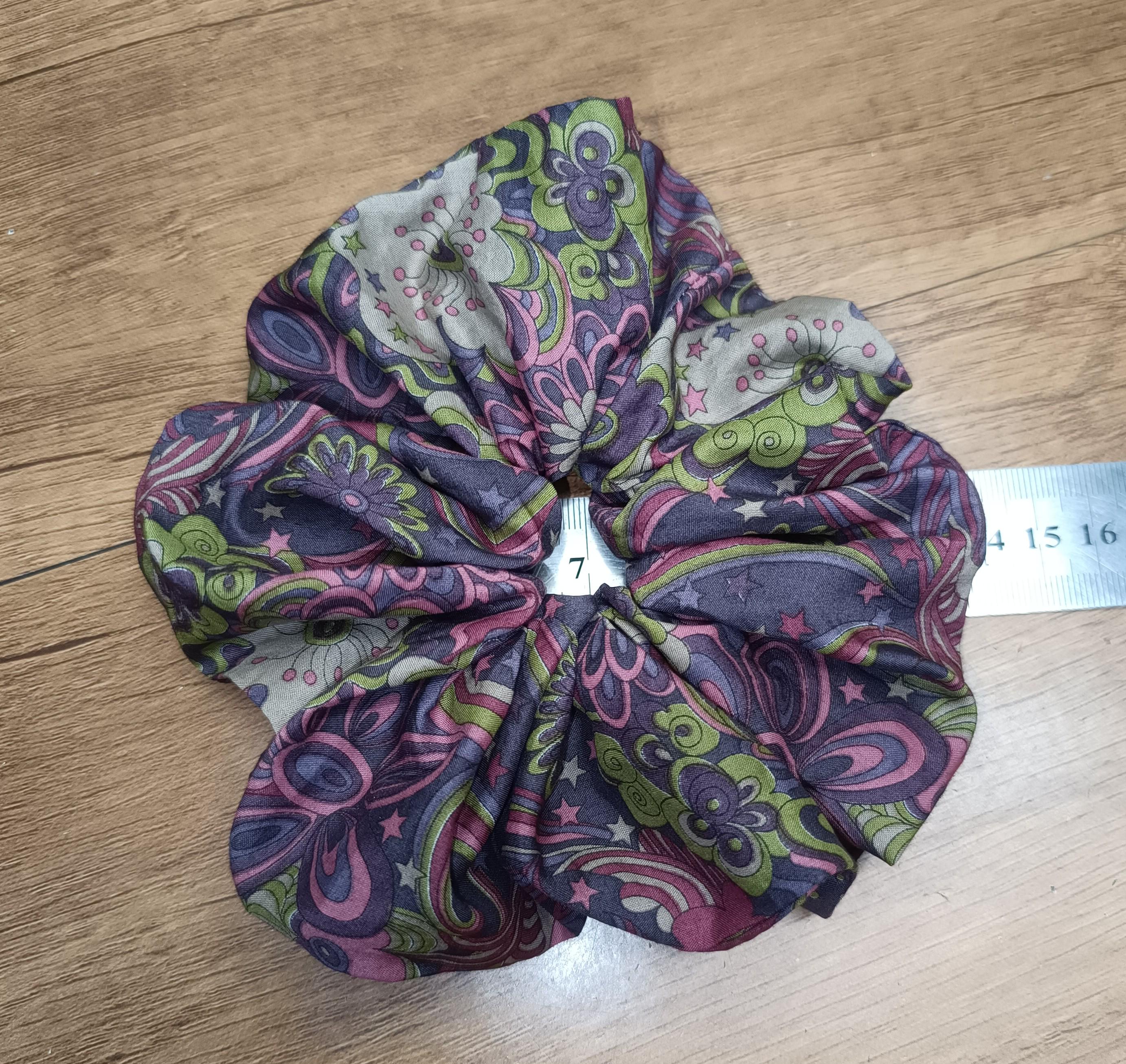 Extra large scrunchie, approximately 14/15 cm in diameter, elastic 2 to 3 turns depending on the thickness of the hair.