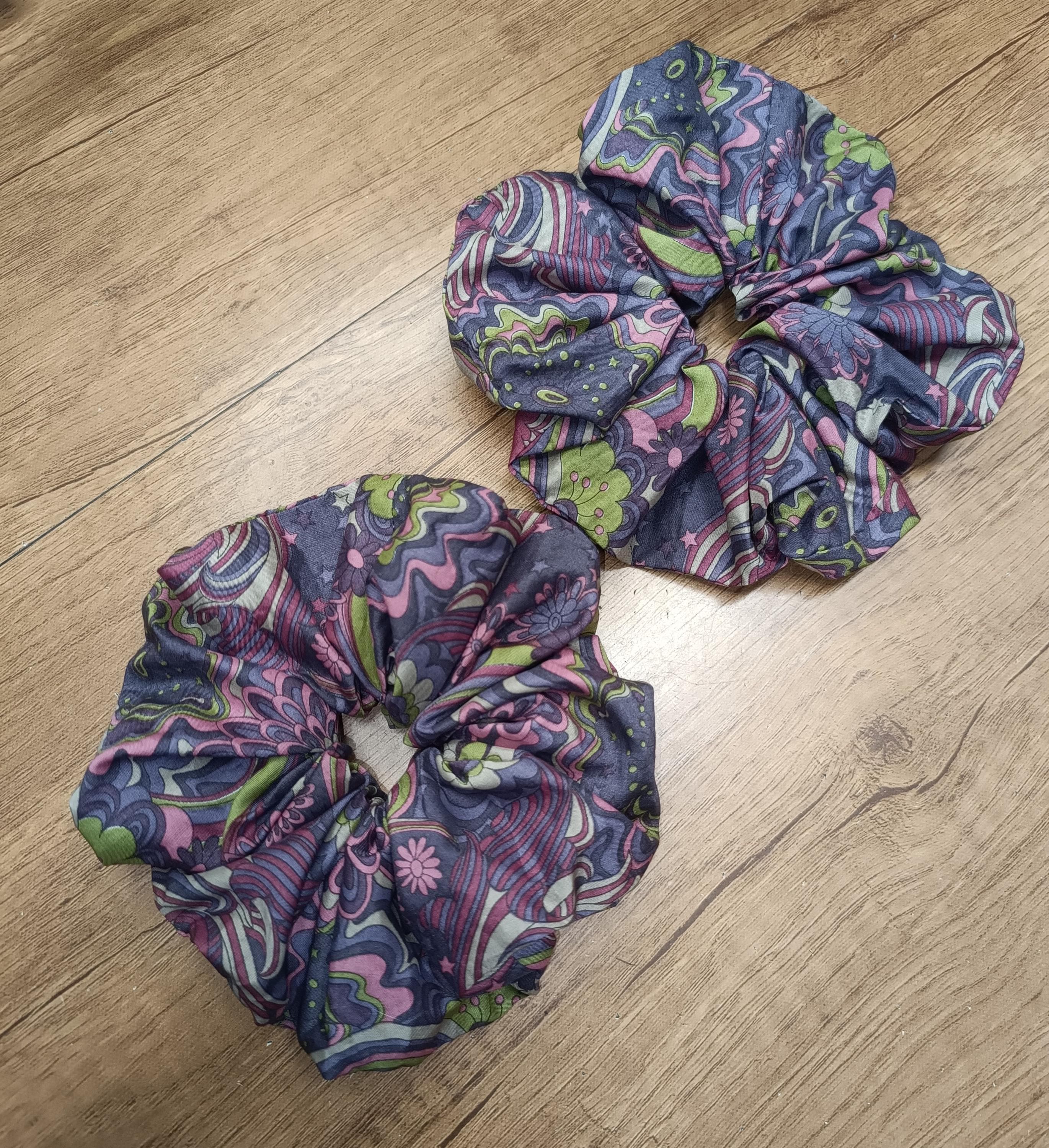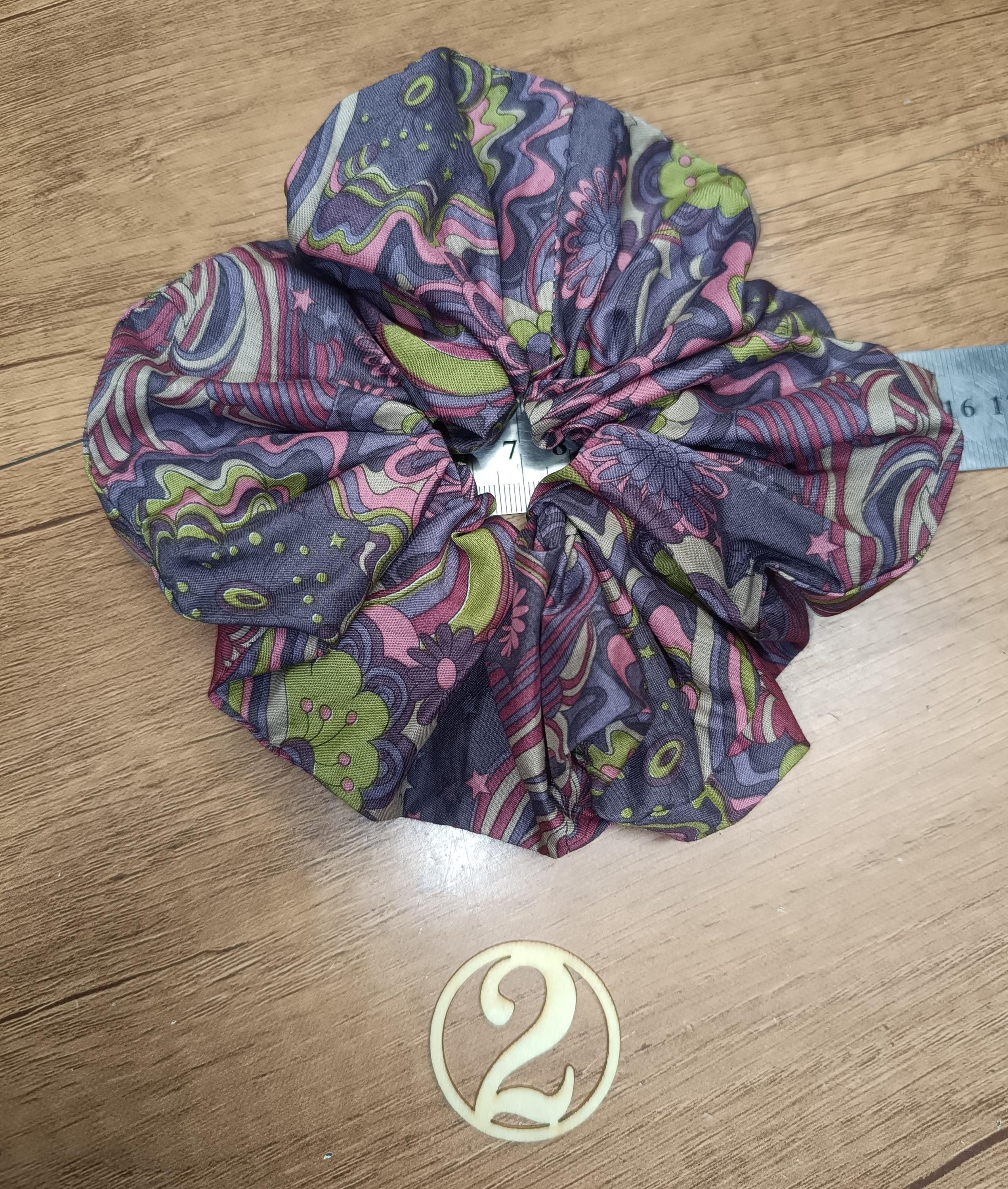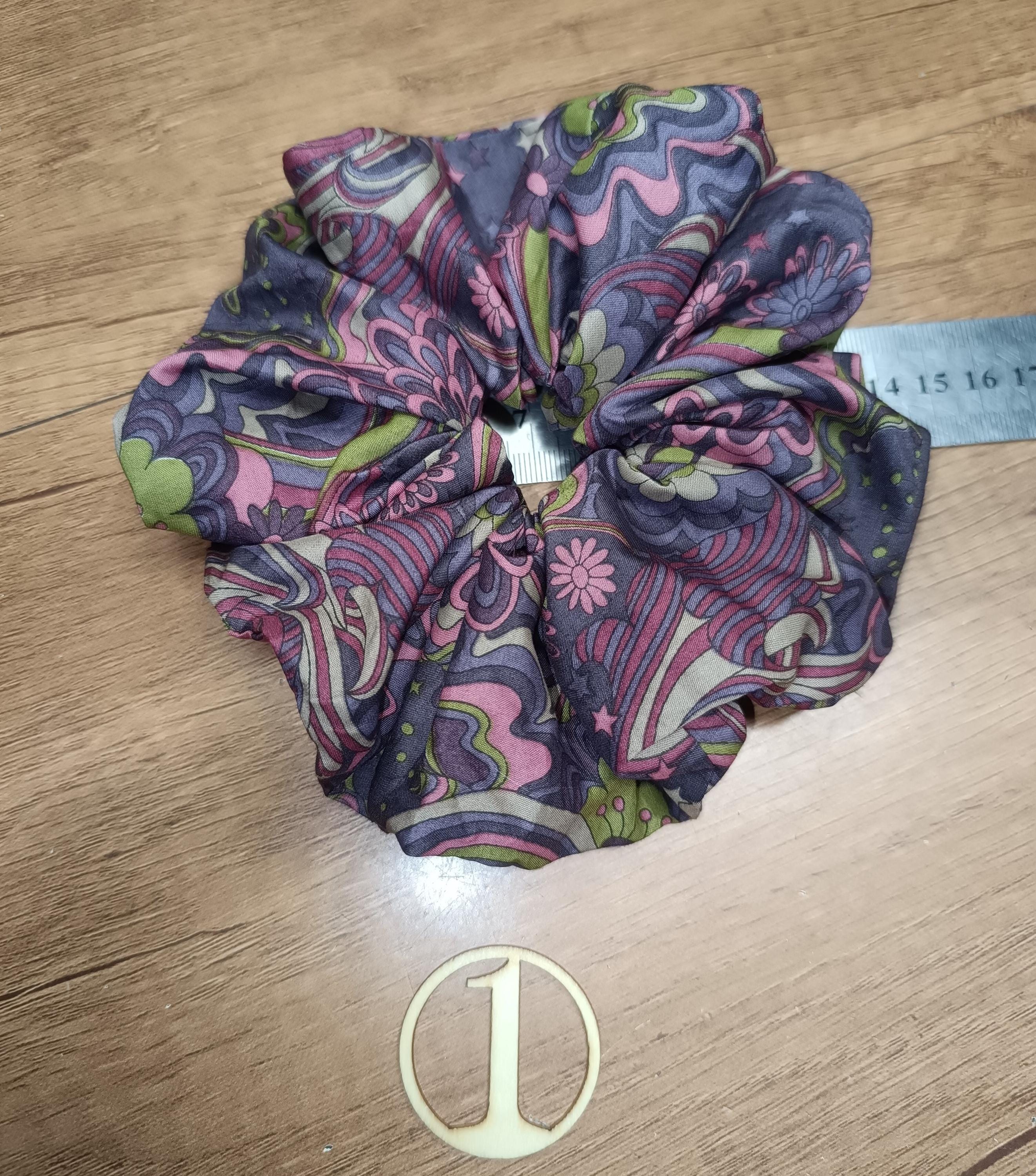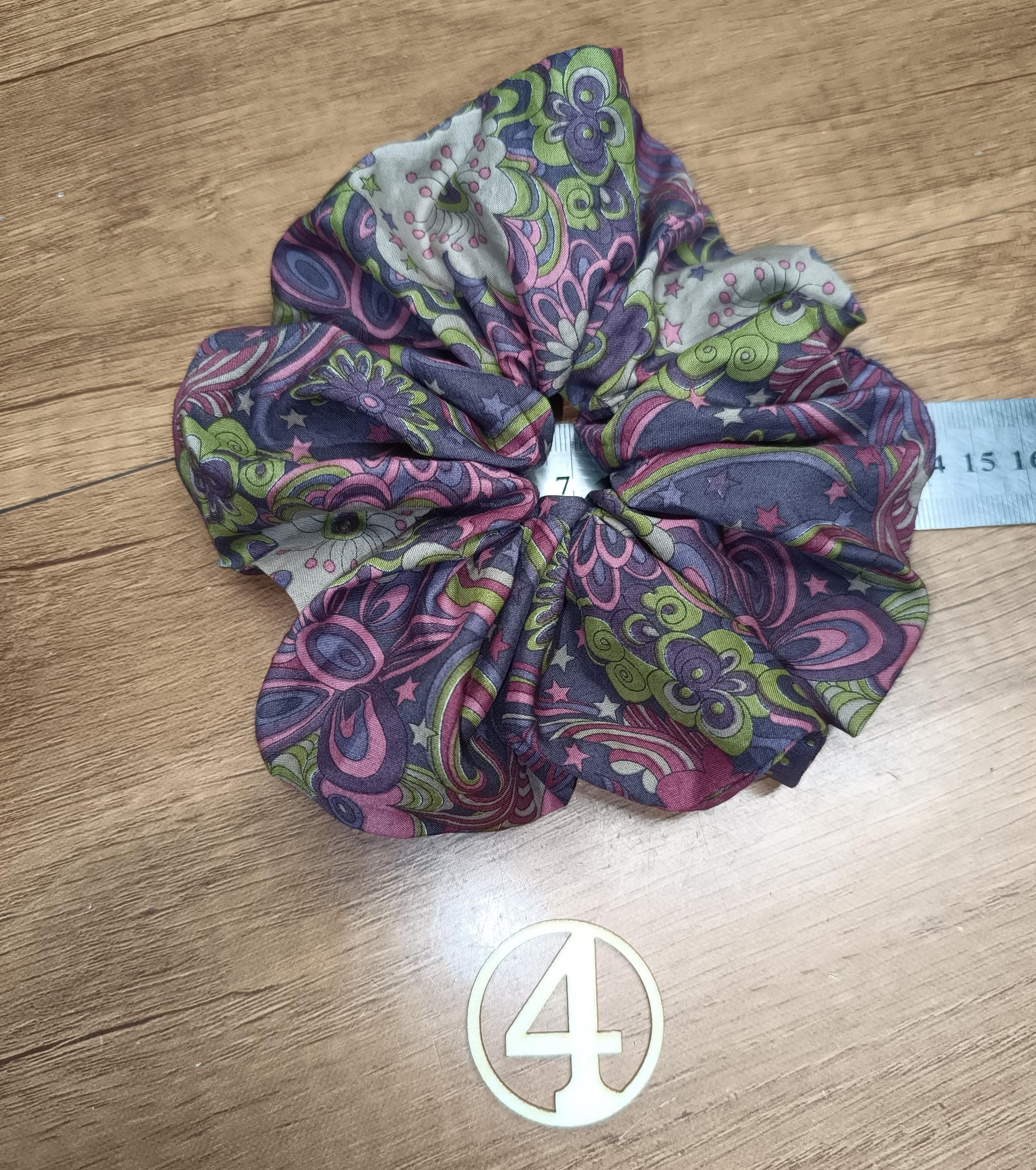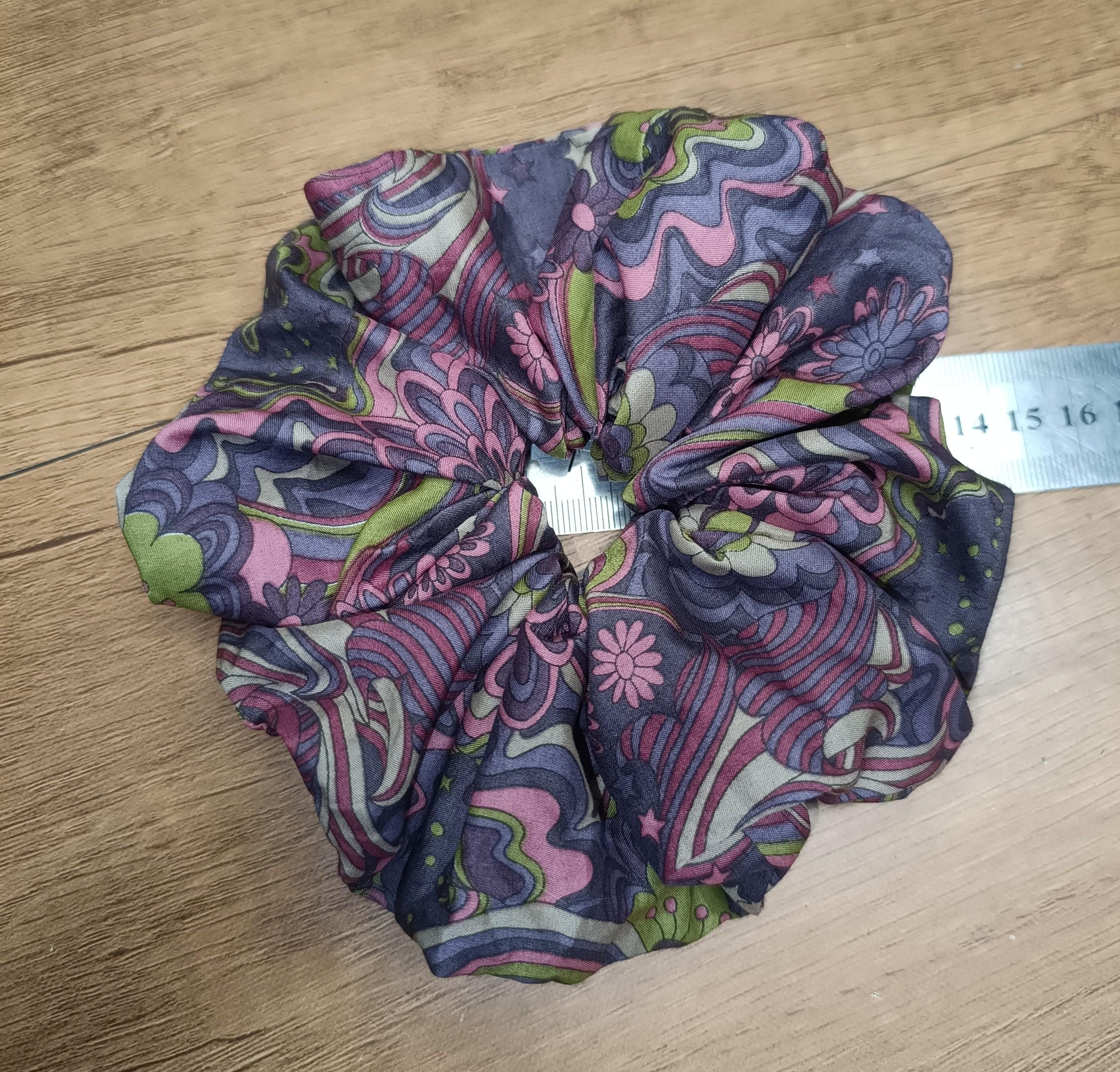 Extra large scrunchie, approximately 14/15 cm in diameter, elastic 2 to 3 turns depending on the thickness of the hair.