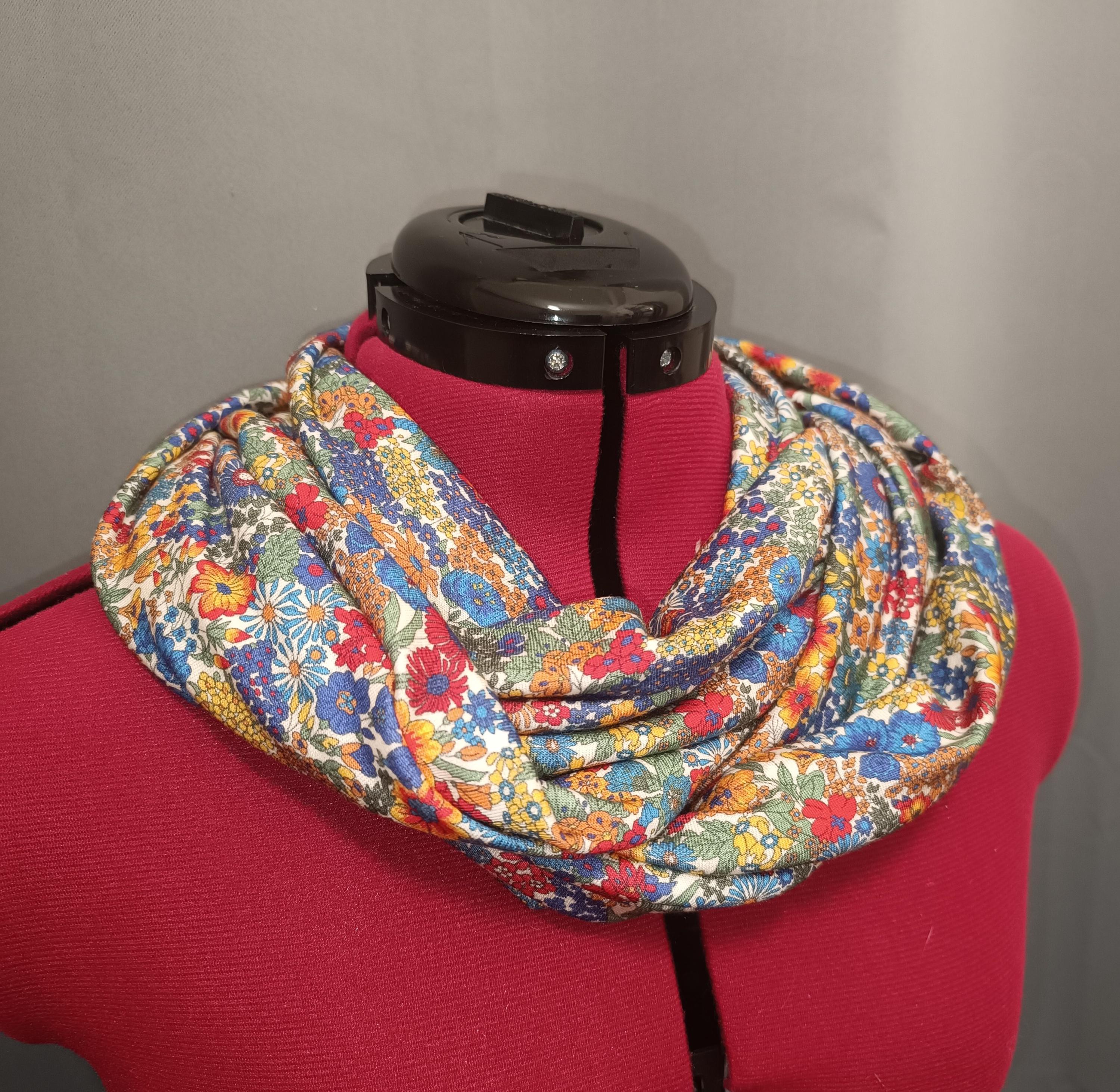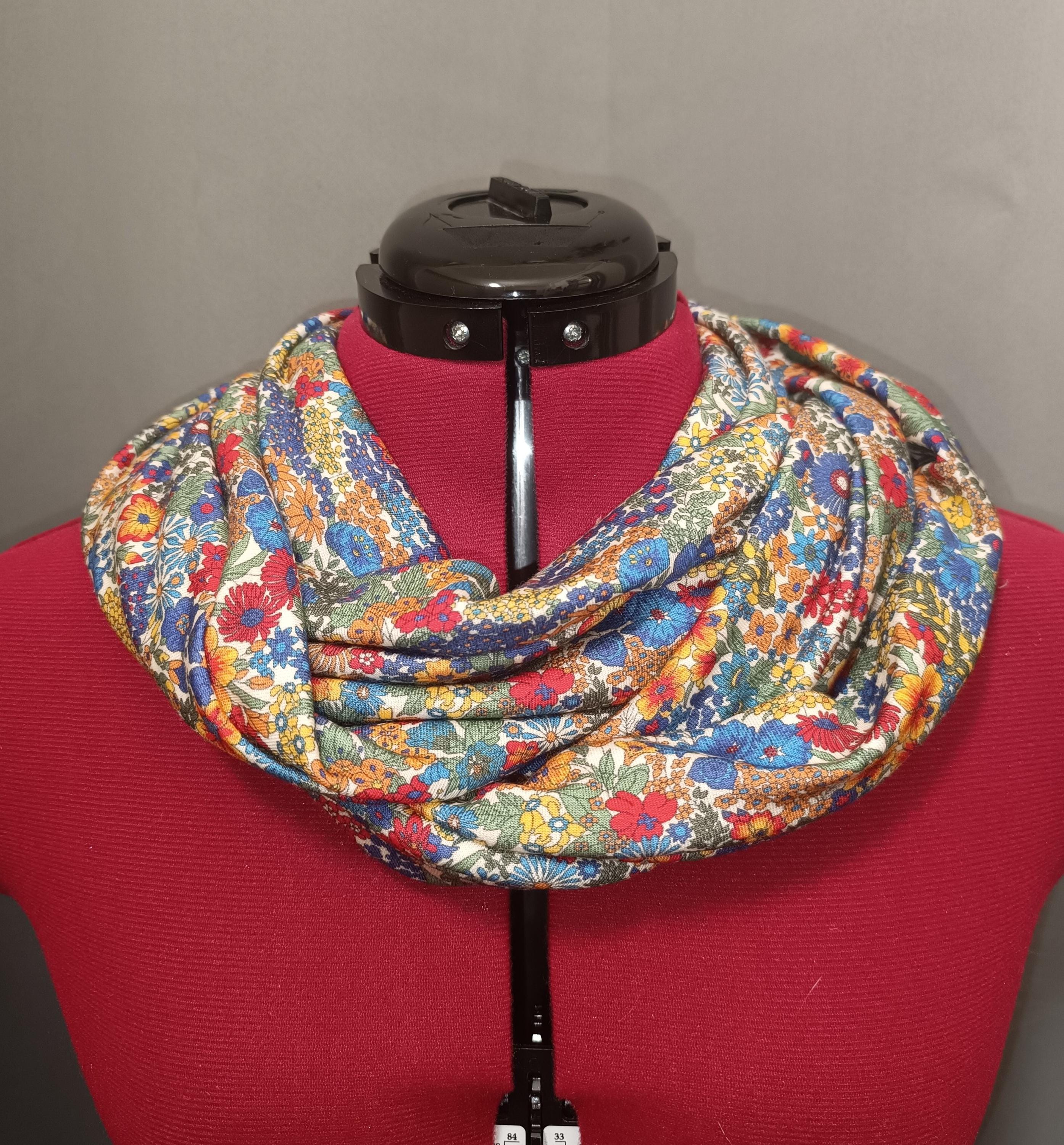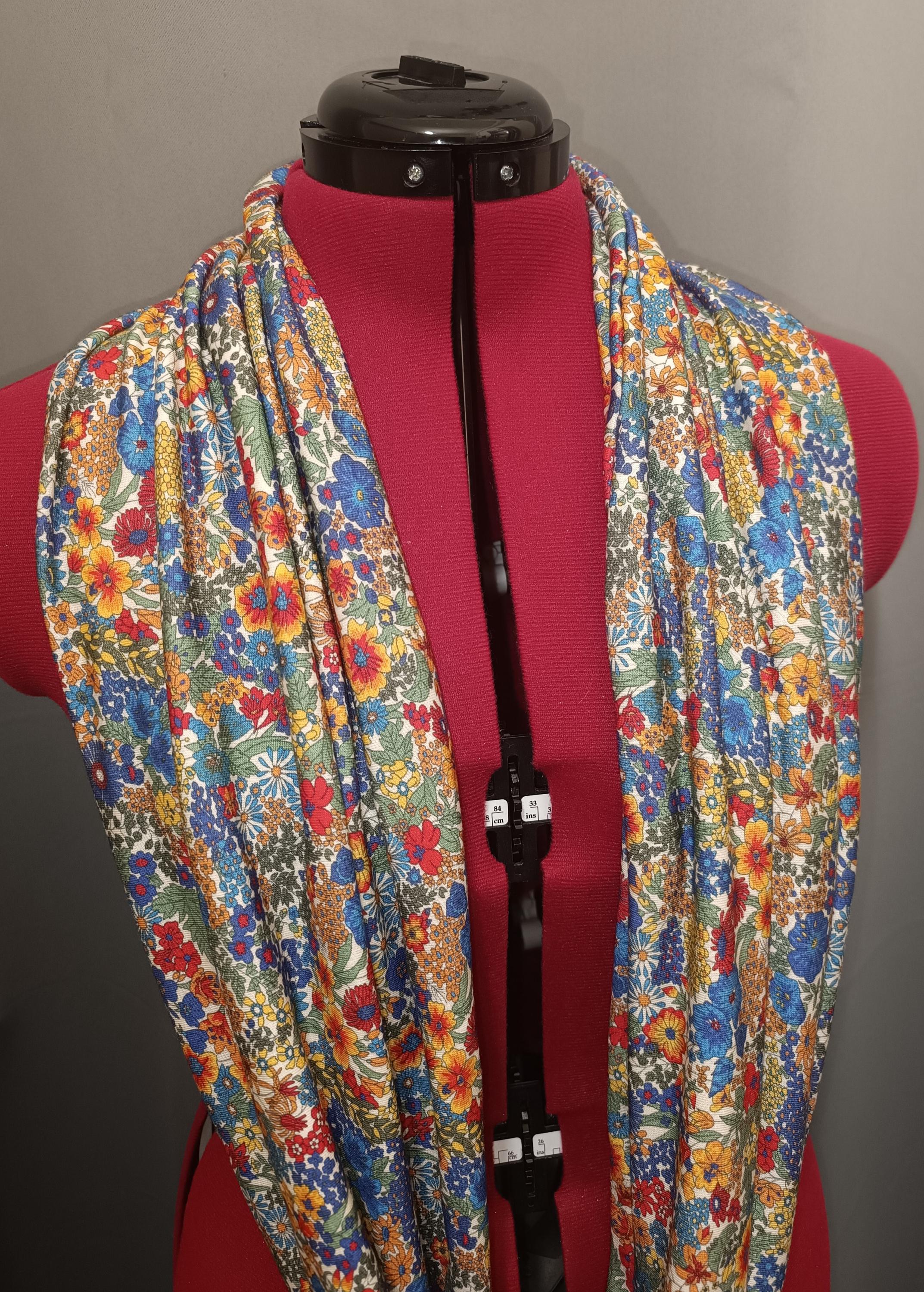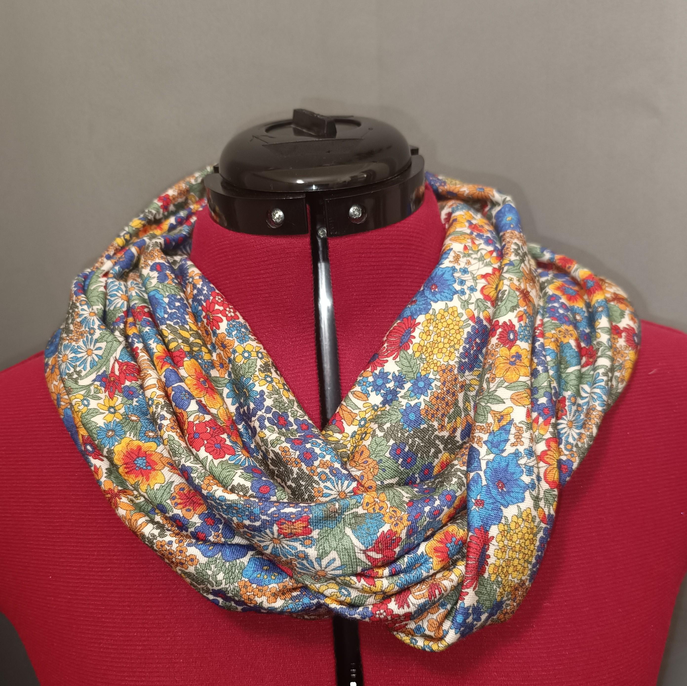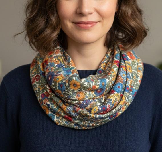 Magnificent circular infinity scarf in Liberty cashmere and wool jersey, Margaret Annie rainbow pattern.