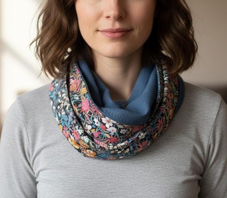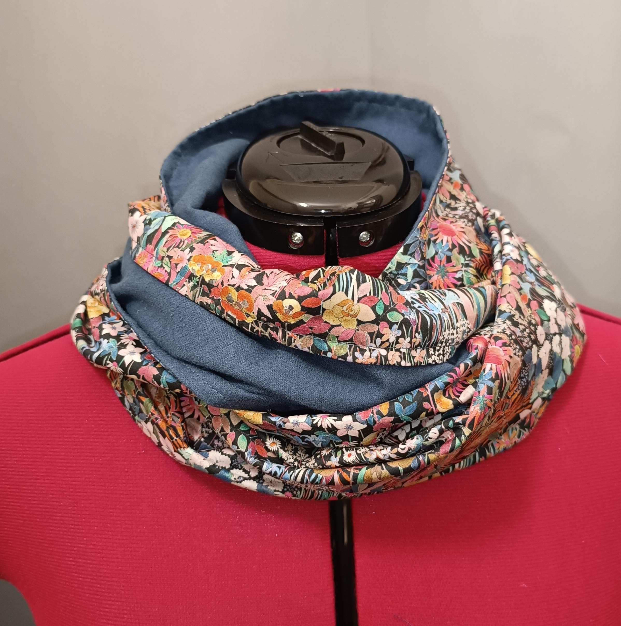 Dimensions: 40cm wide and 130cm circumference (double snood, 2 wraps). Finished with topstitched edges.