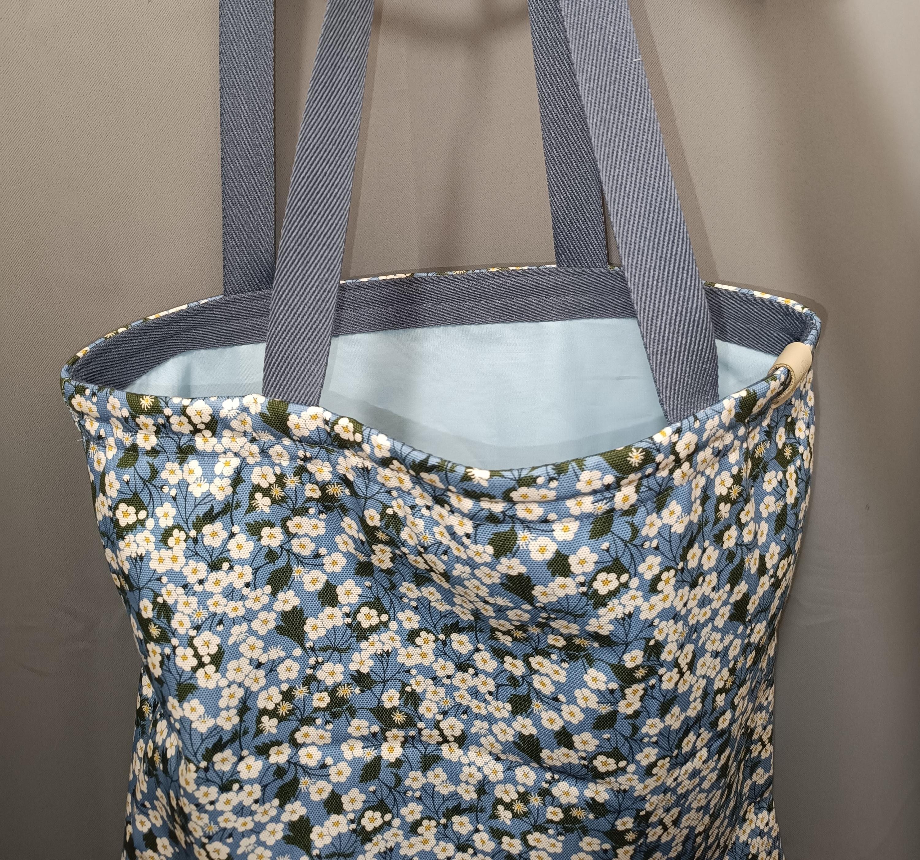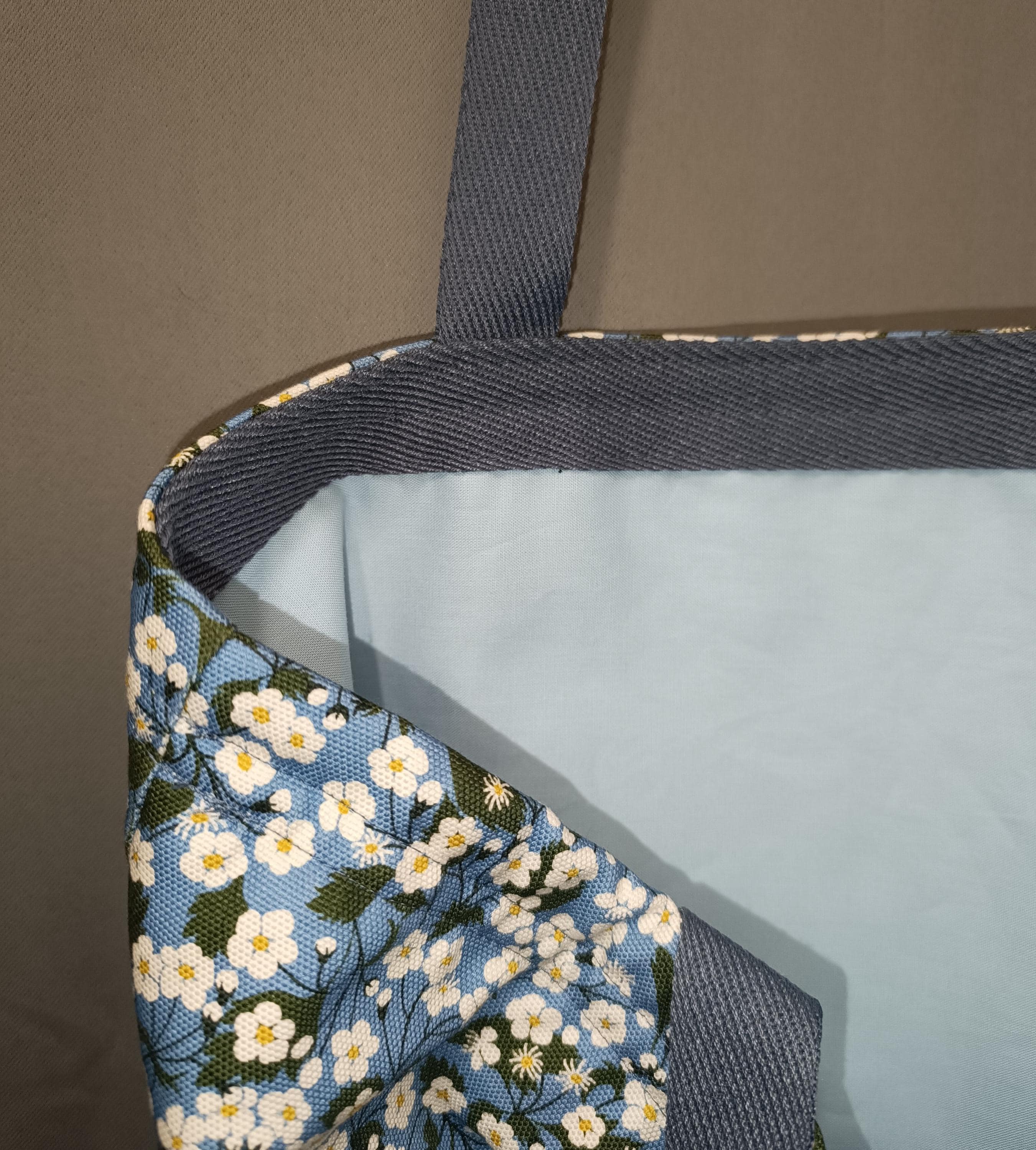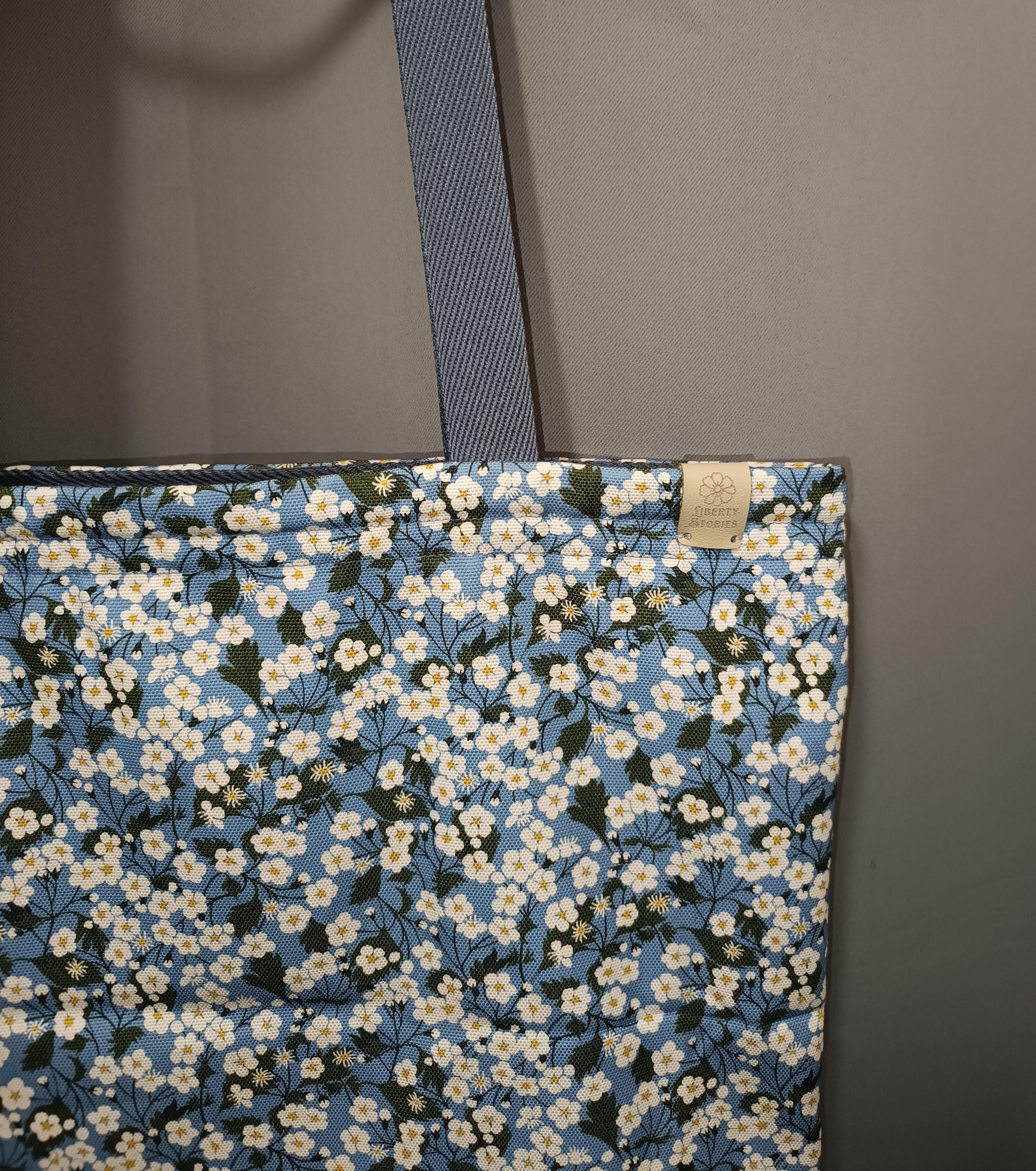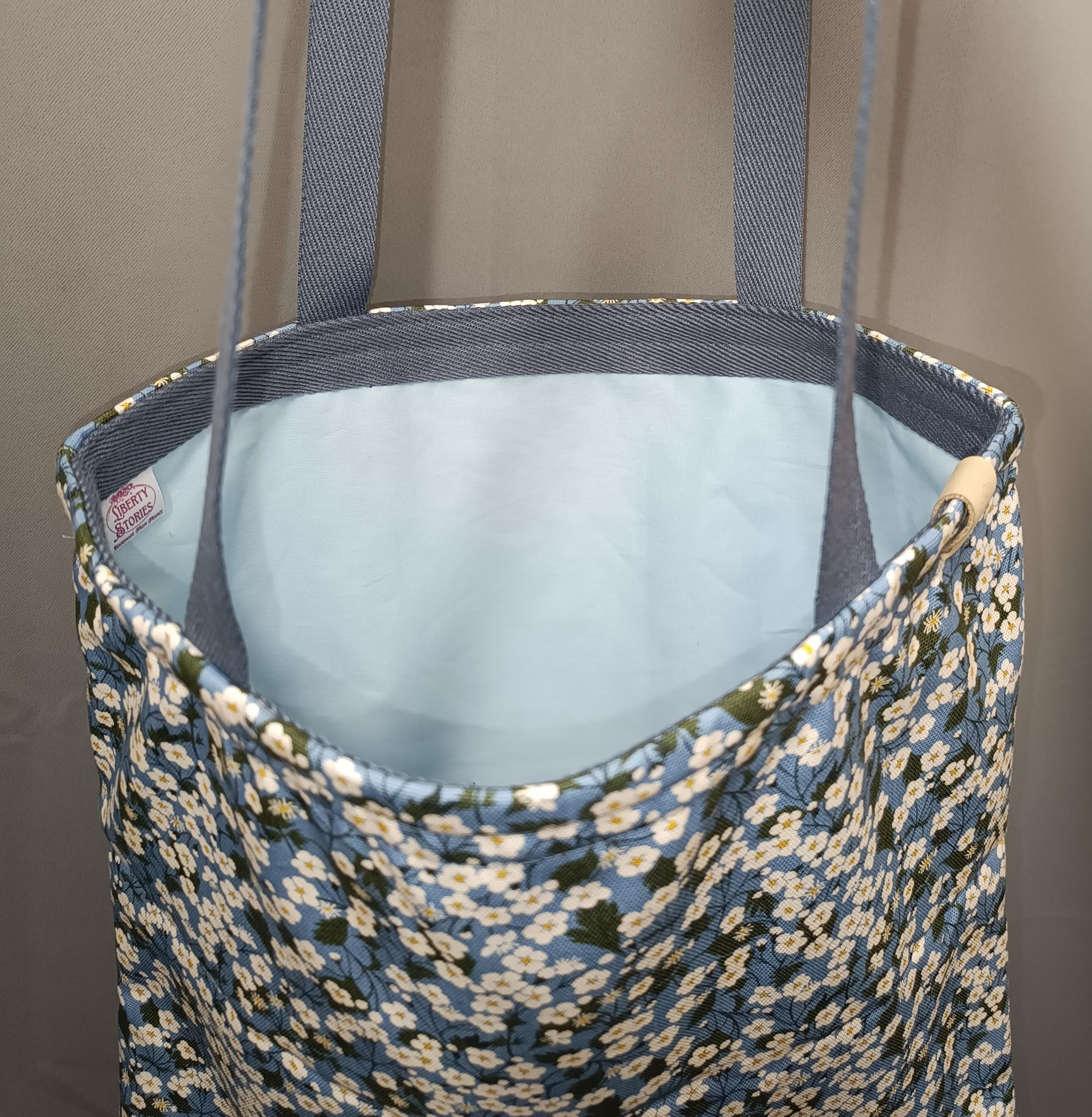 Exterior: Liberty Mitsi blue canvas, thick 100% cotton, lined with plain pure cotton poplin, cotton handles. Reinforced top band for added strength.