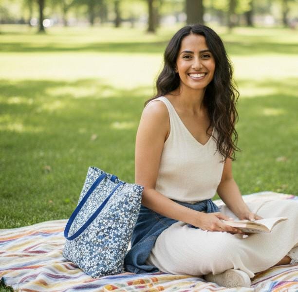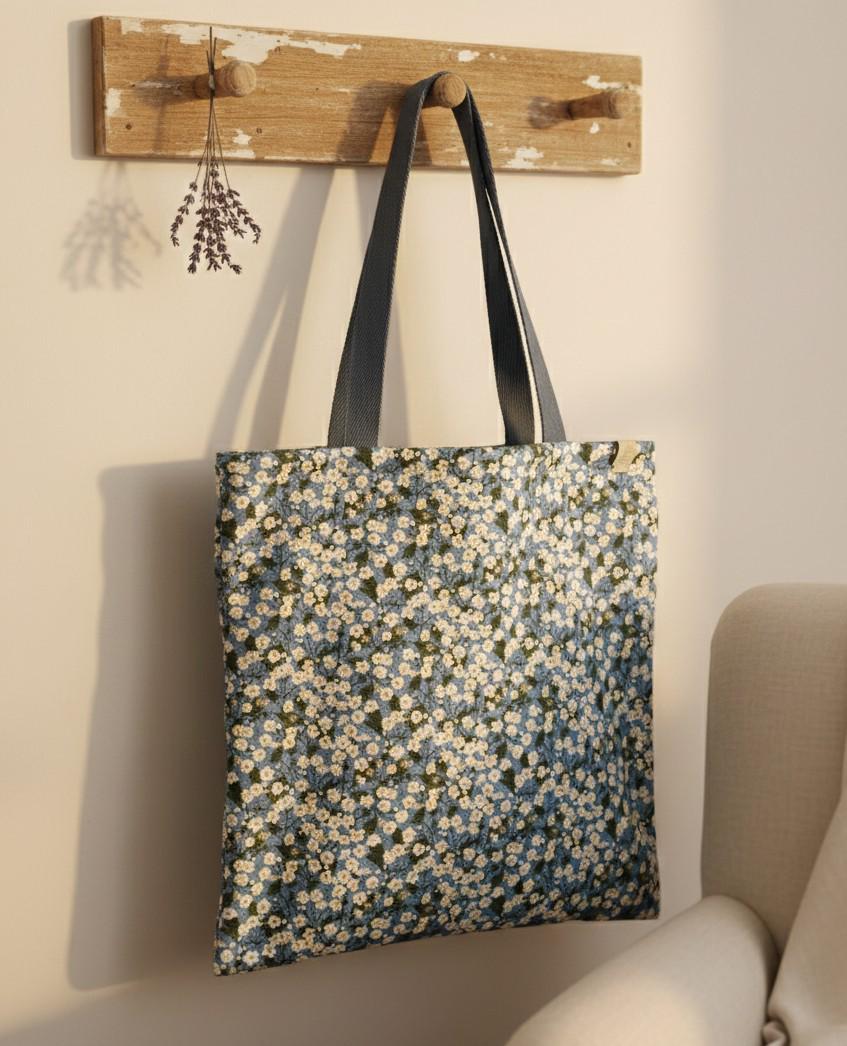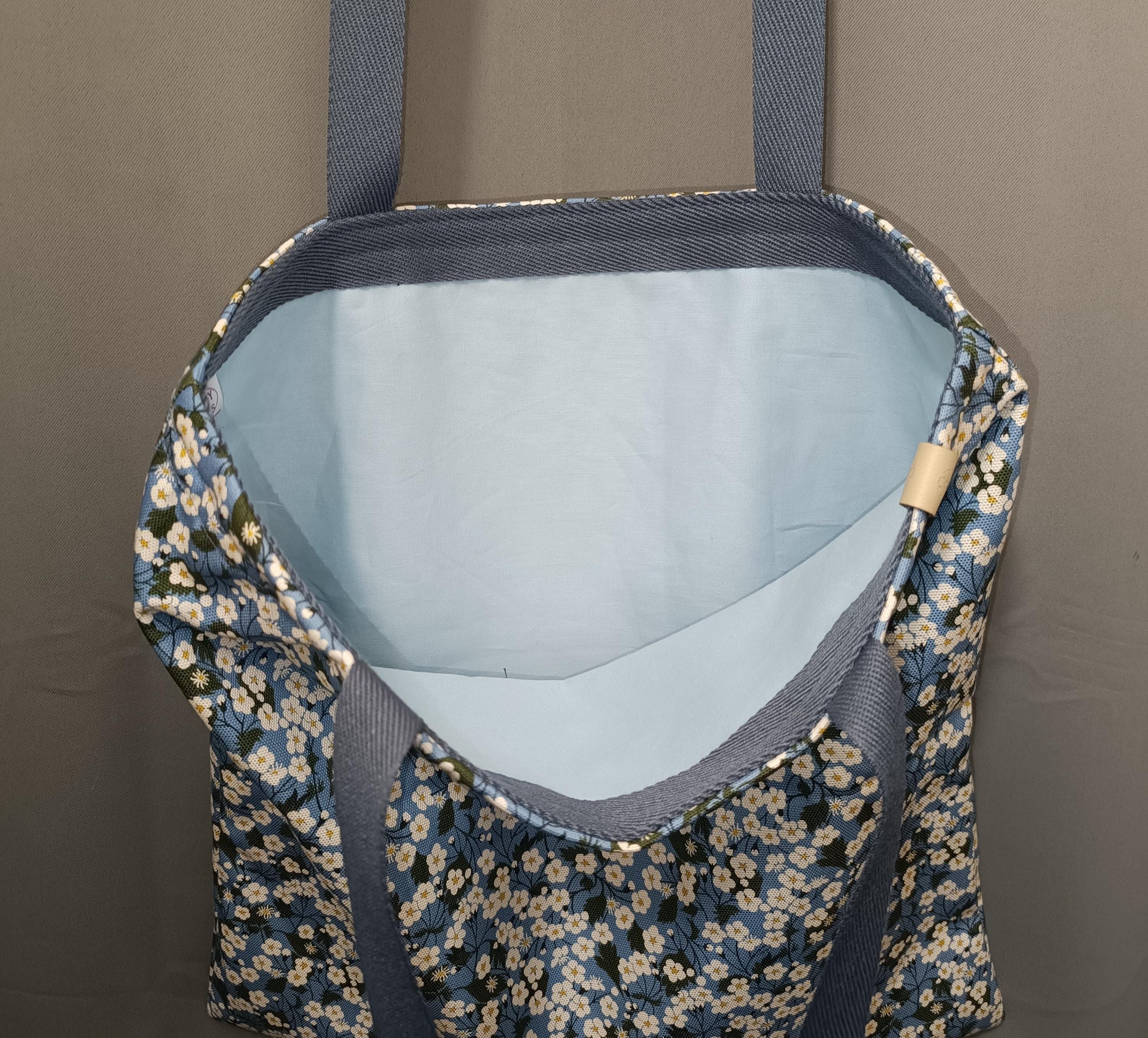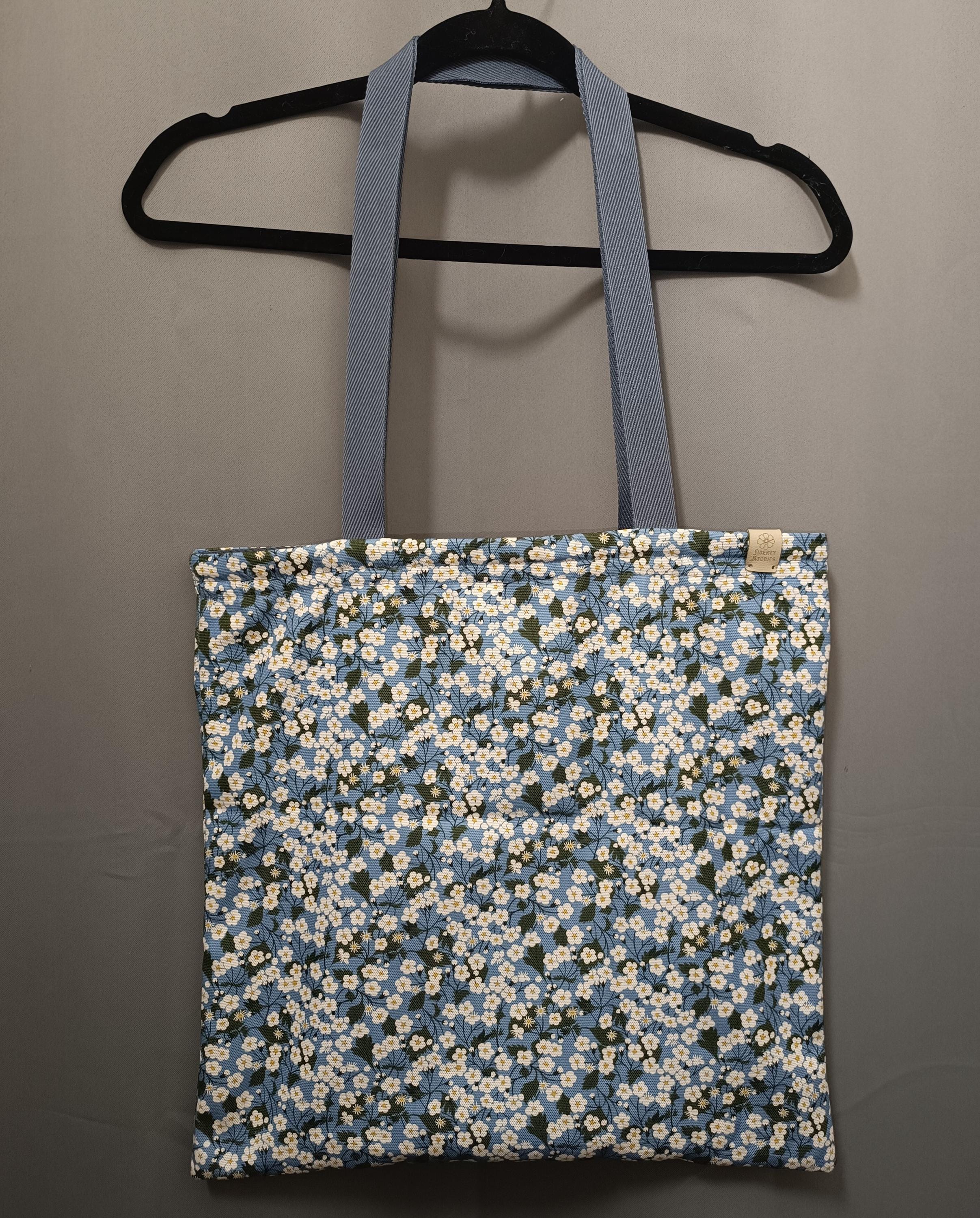 Exterior: Liberty Mitsi blue canvas, thick 100% cotton, lined with plain pure cotton poplin, cotton handles. Reinforced top band for added strength.