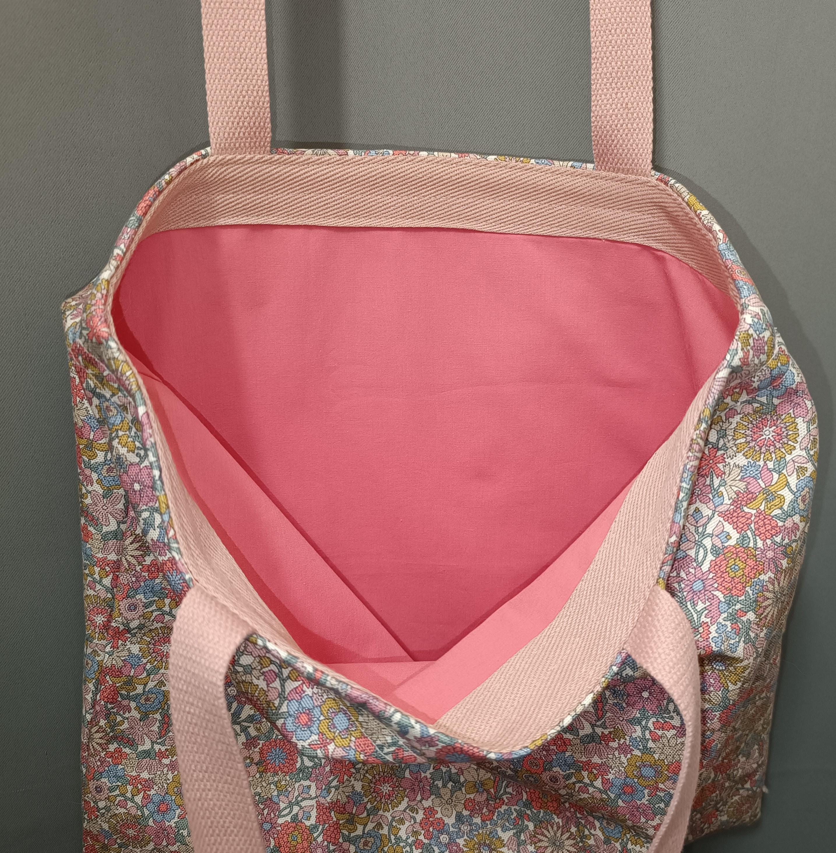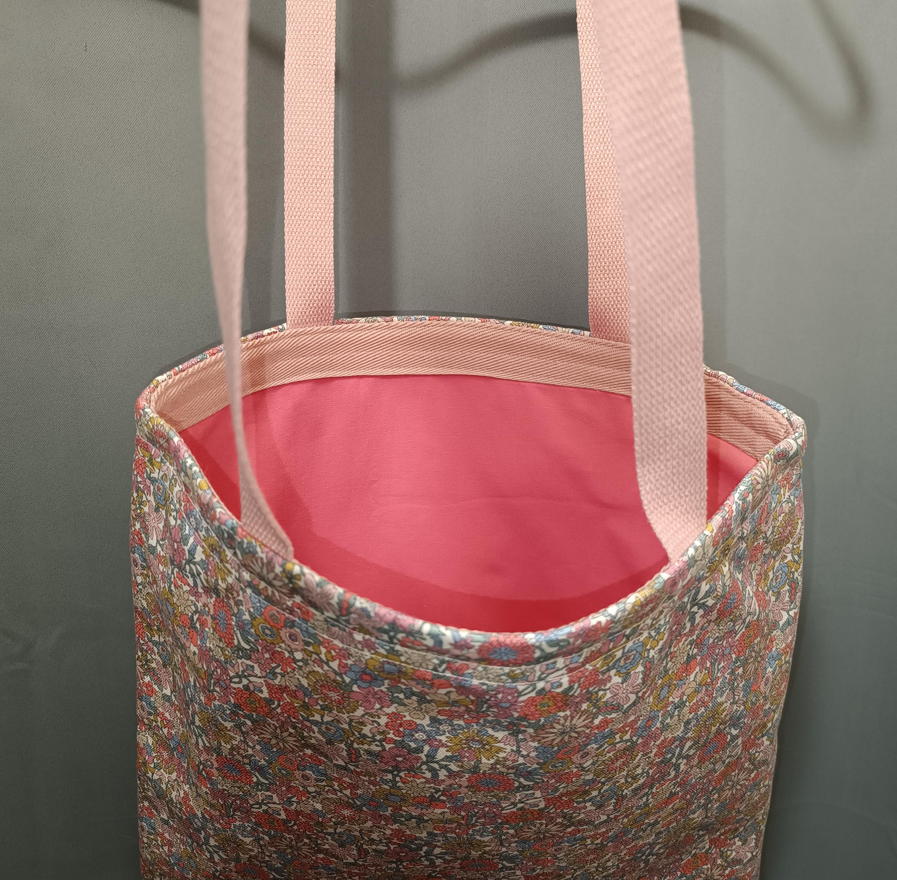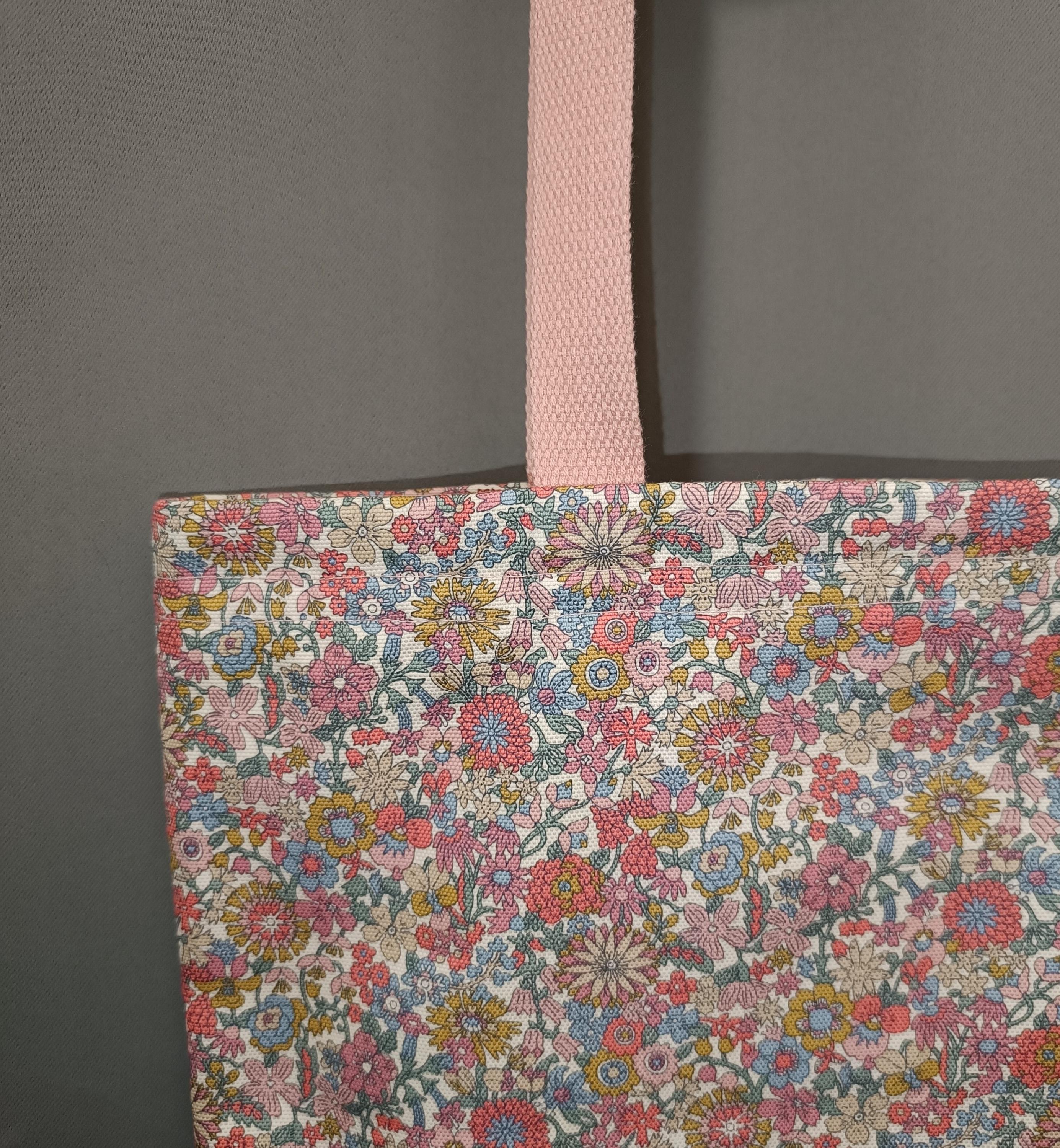Exterior: Liberty June Blossom fabric in thick 100% cotton canvas, lined with plain pure cotton poplin, cotton handles. Reinforced top band for added strength.