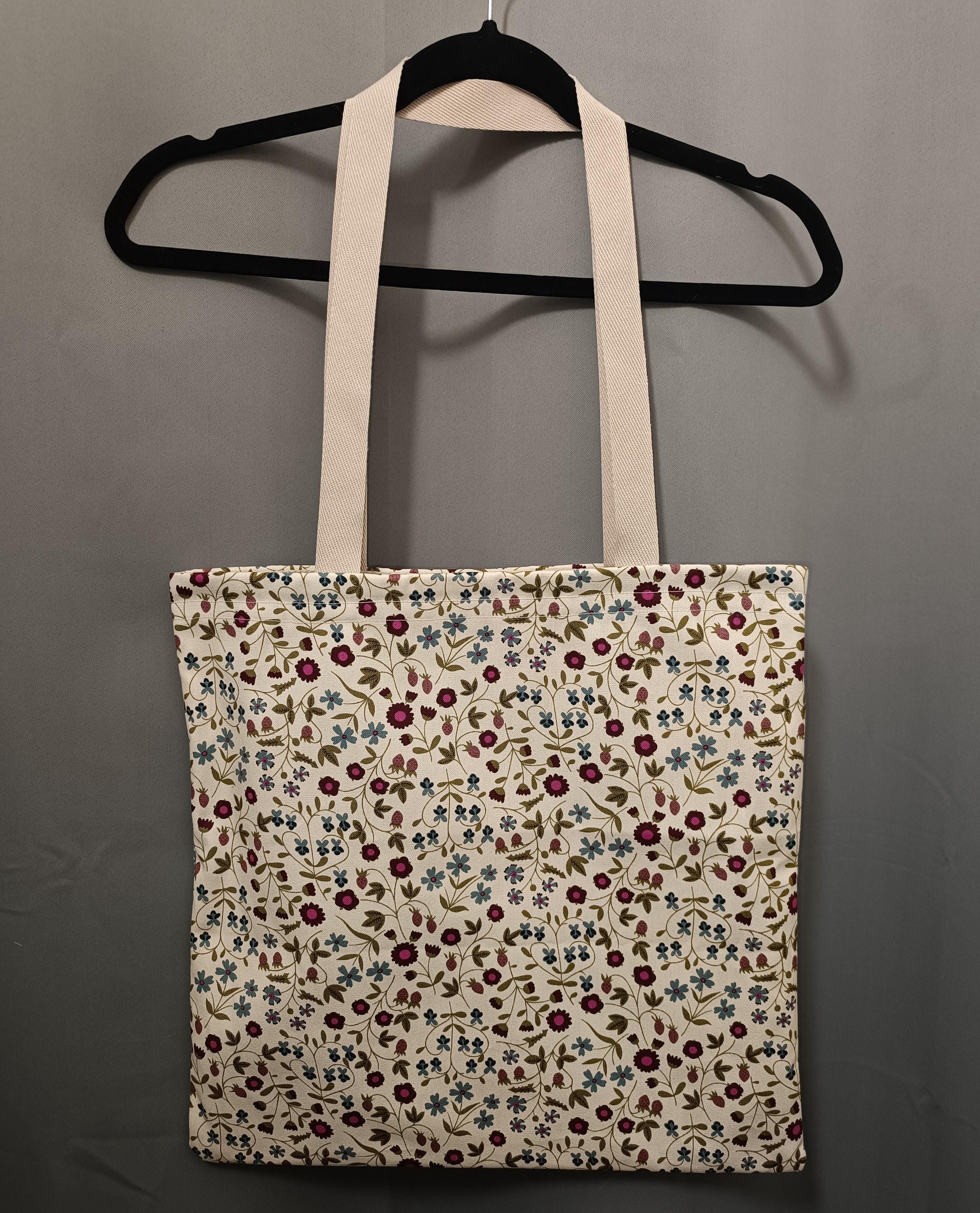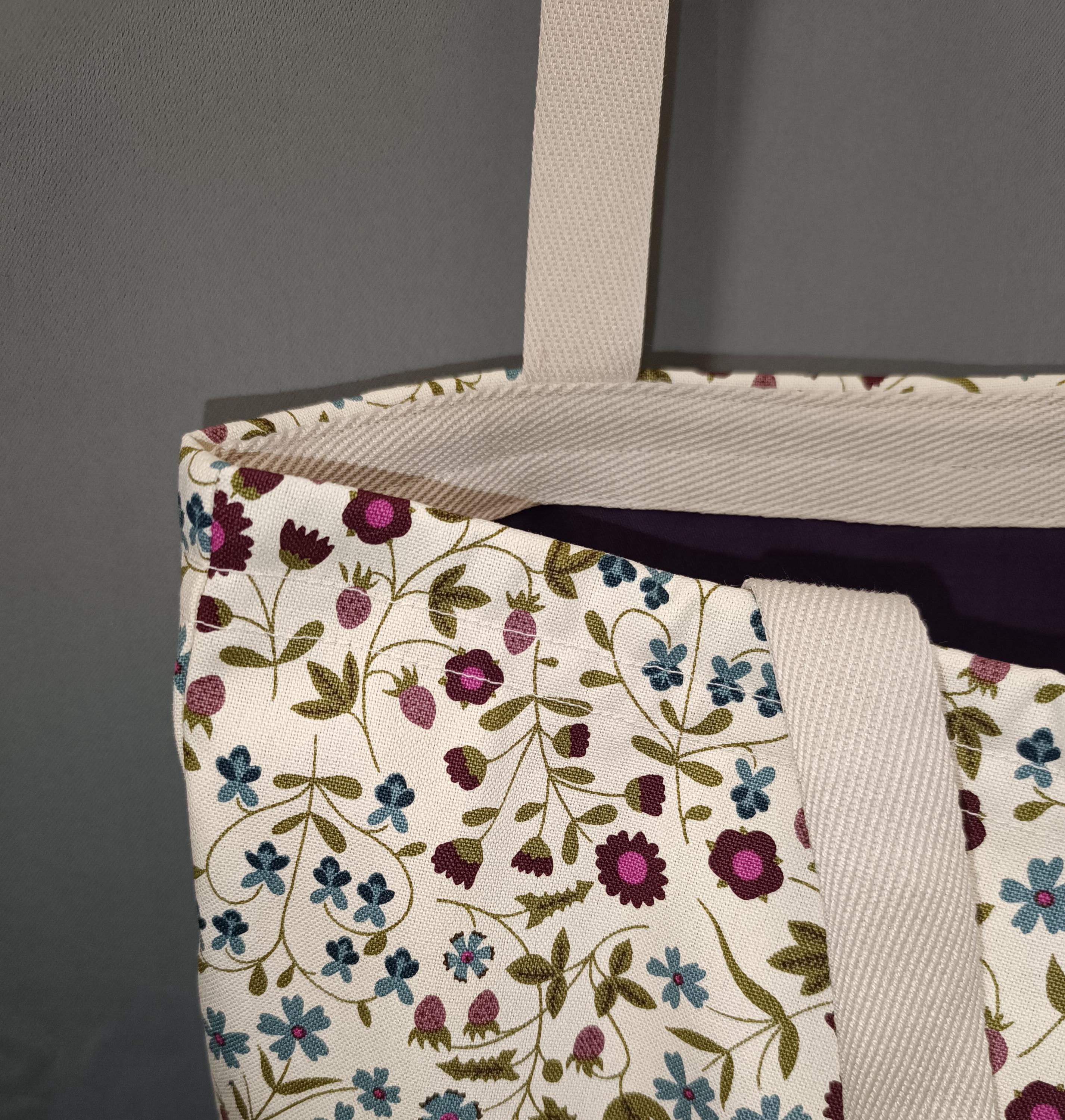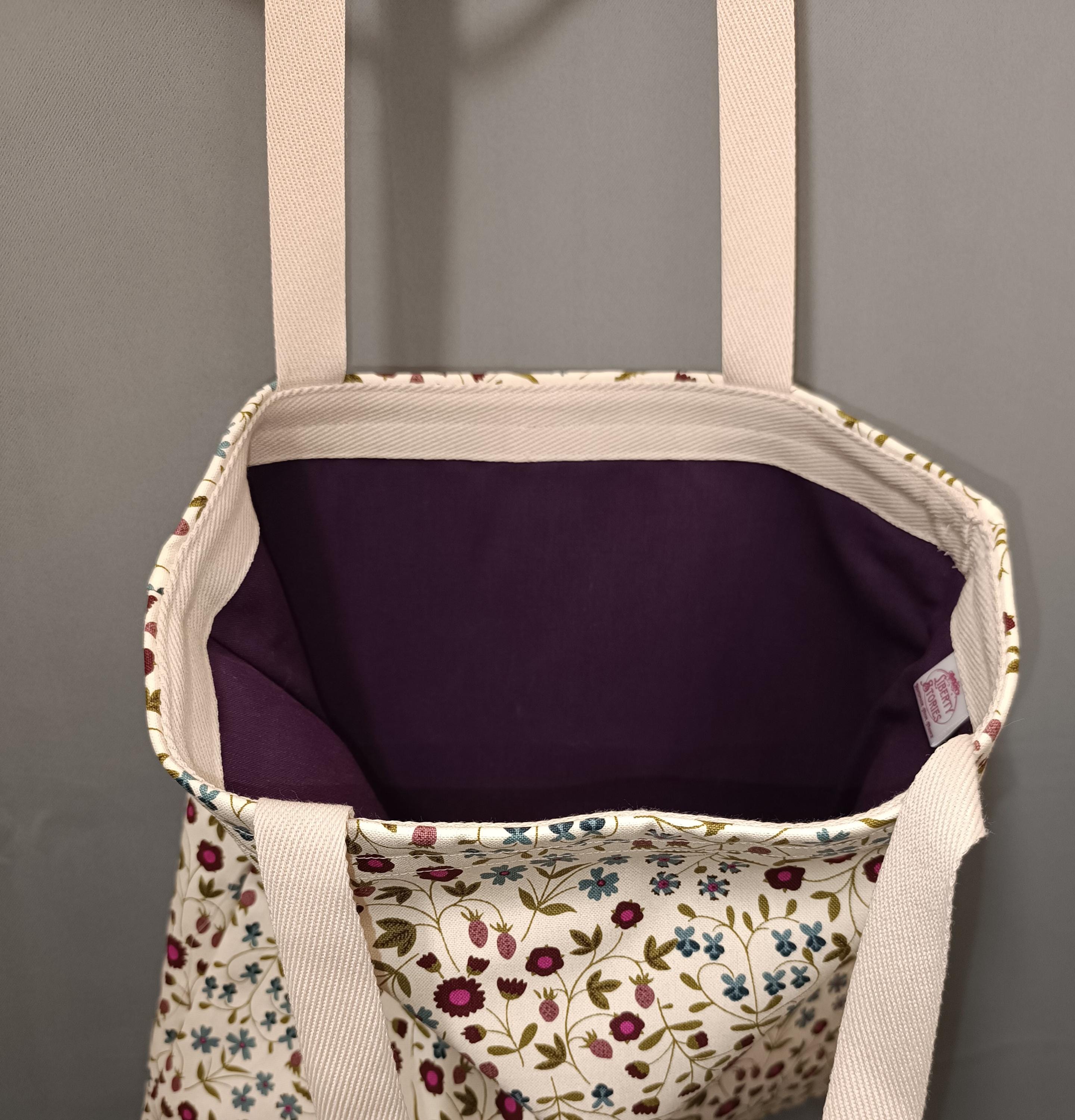 Exterior: Liberty Little Mirabelle purple (Japanese import) thick 100% cotton canvas, lined with plain pure cotton poplin, cotton handles. Reinforced top band for added strength.