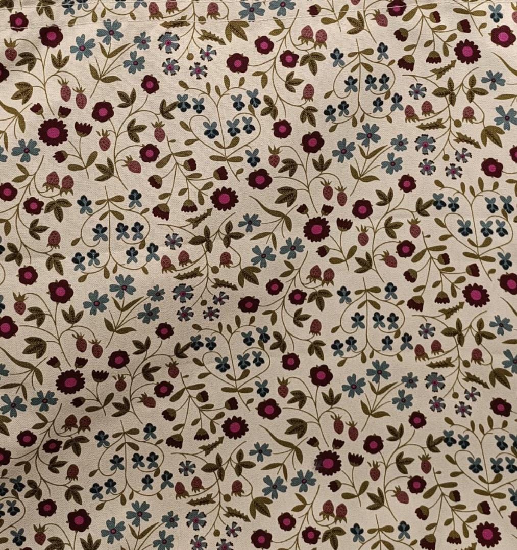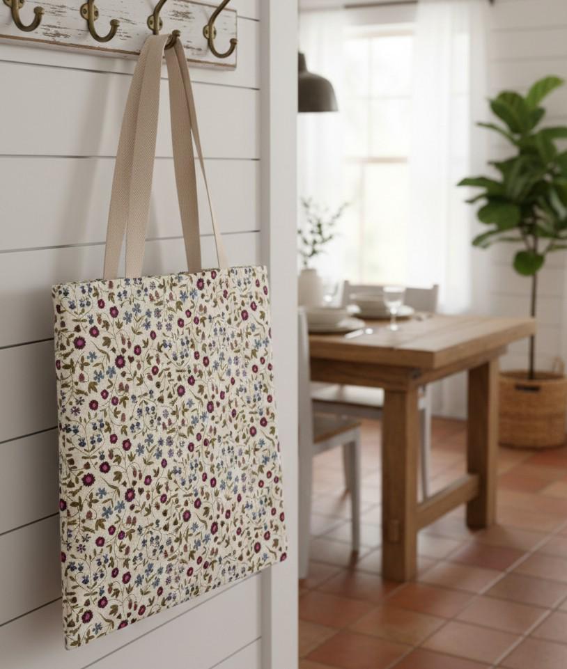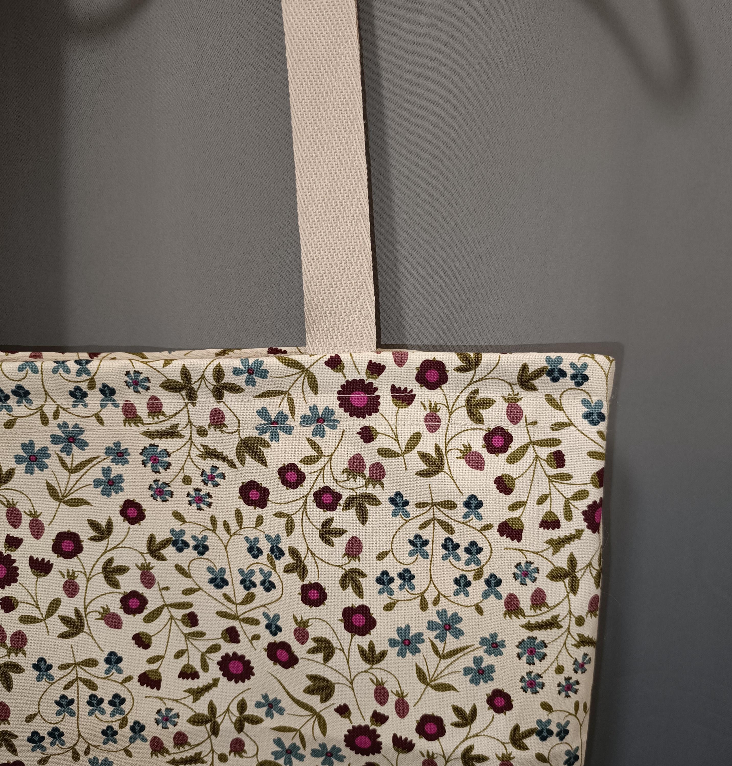 Exterior: Liberty Little Mirabelle purple (Japanese import) thick 100% cotton canvas, lined with plain pure cotton poplin, cotton handles. Reinforced top band for added strength.
