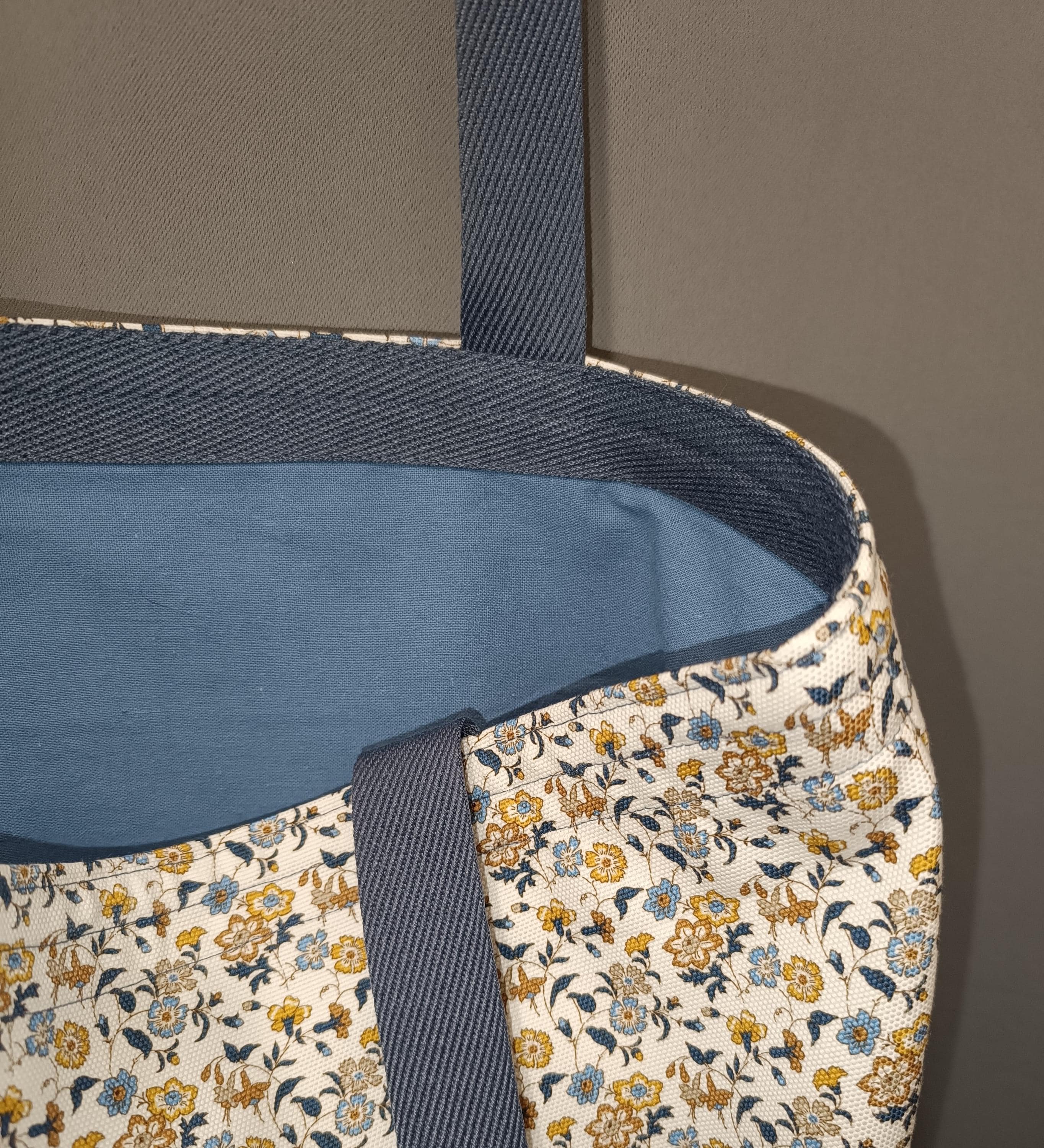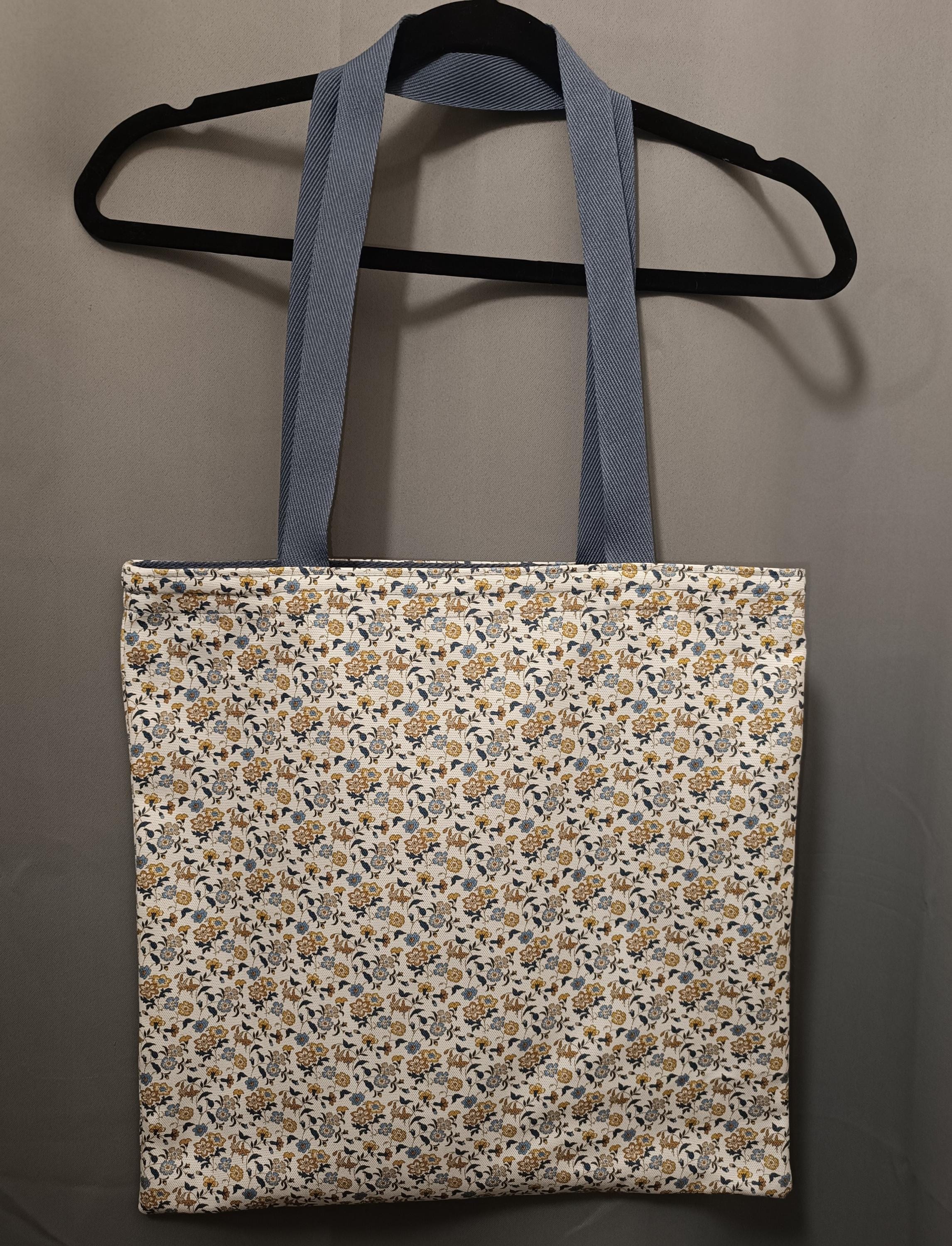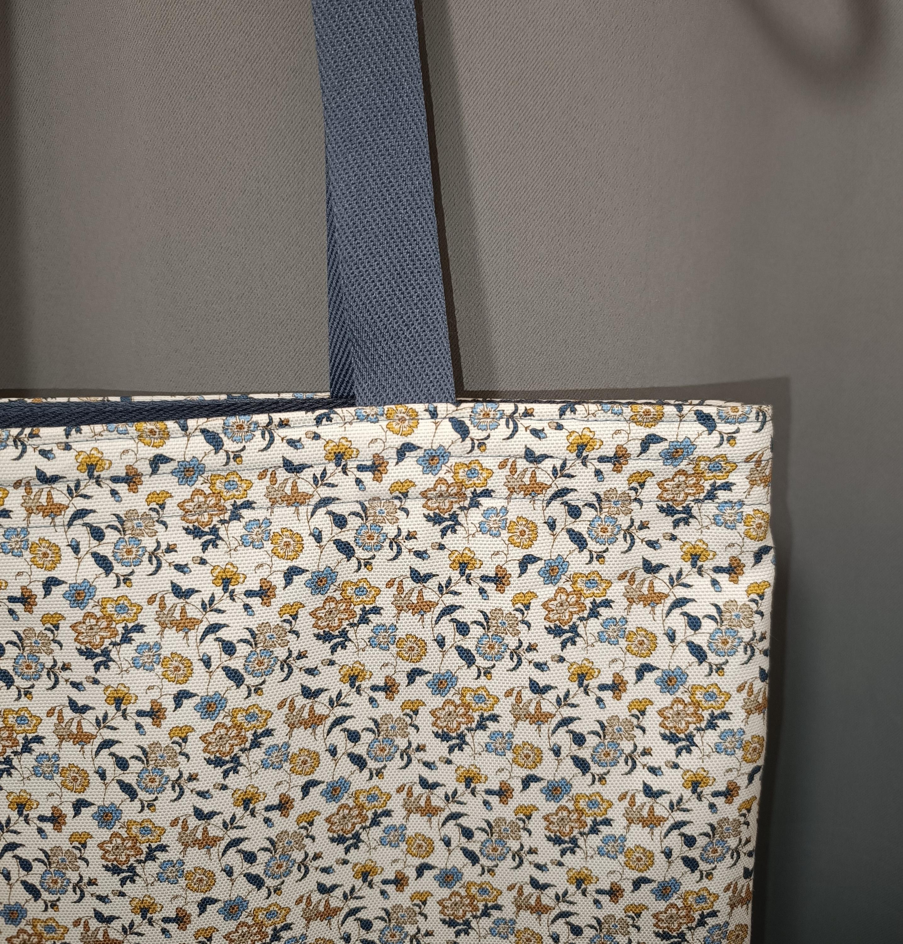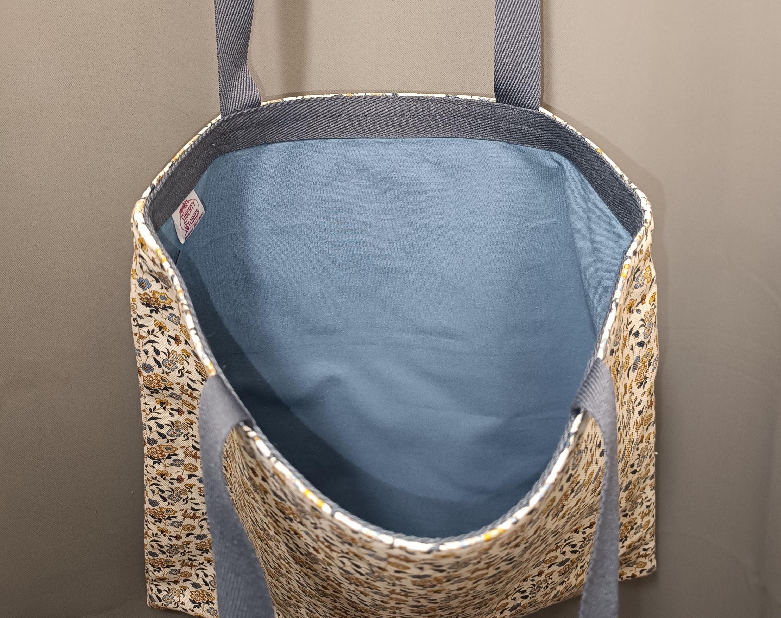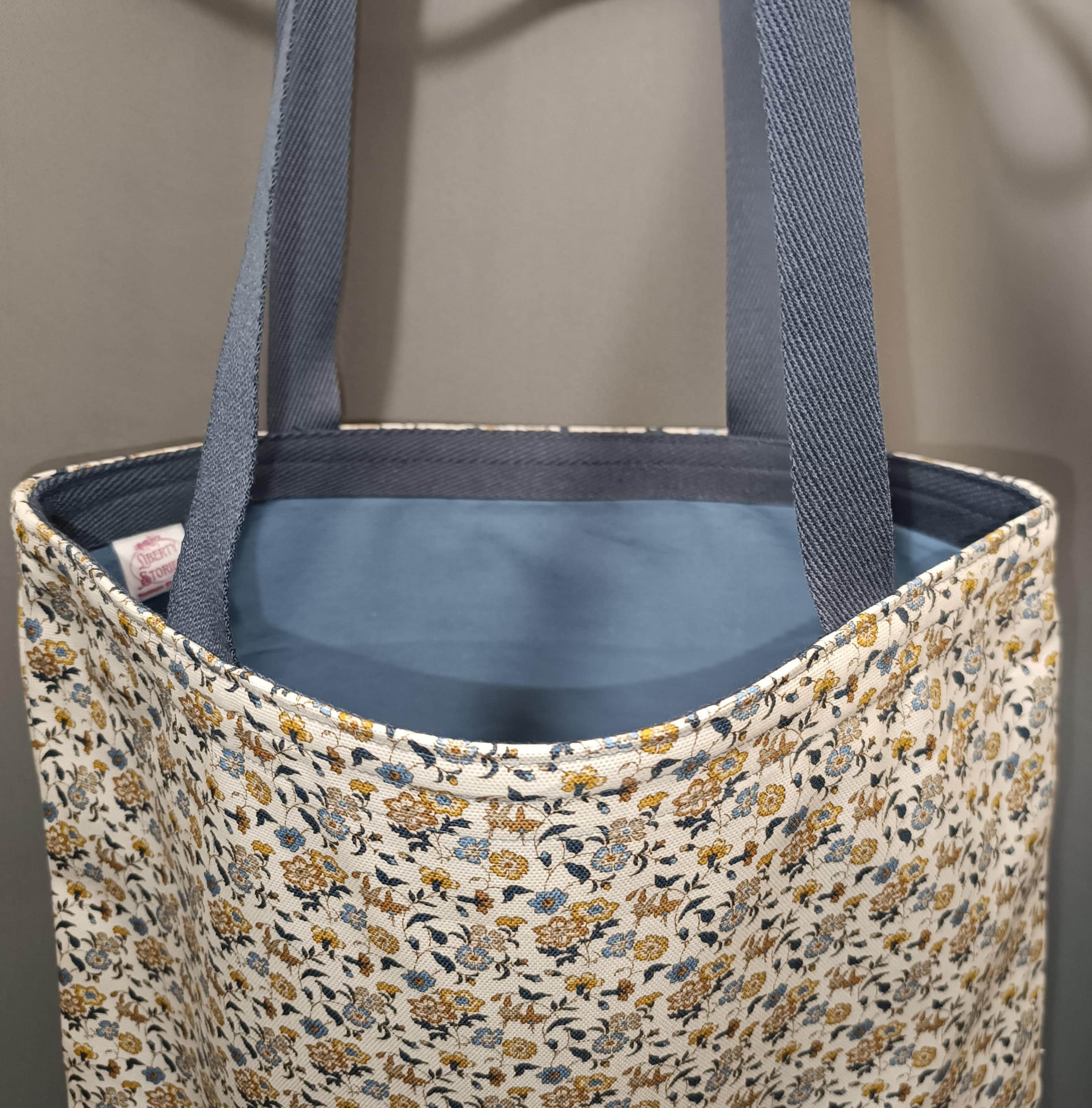 Exterior: Liberty Aisha thick 100% cotton canvas, lined with plain cotton, cotton handles. Reinforced top band for added strength.